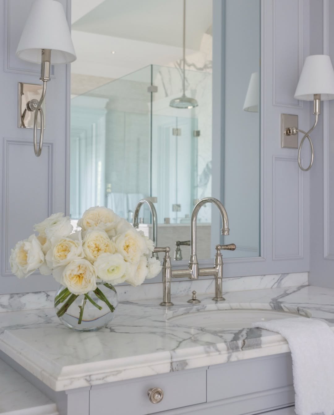 This is timeless bathroom styling at its best. Marble countertops, polished fixtures, and a soft bouquet of florals create that classic, almost hotel-like elegance.