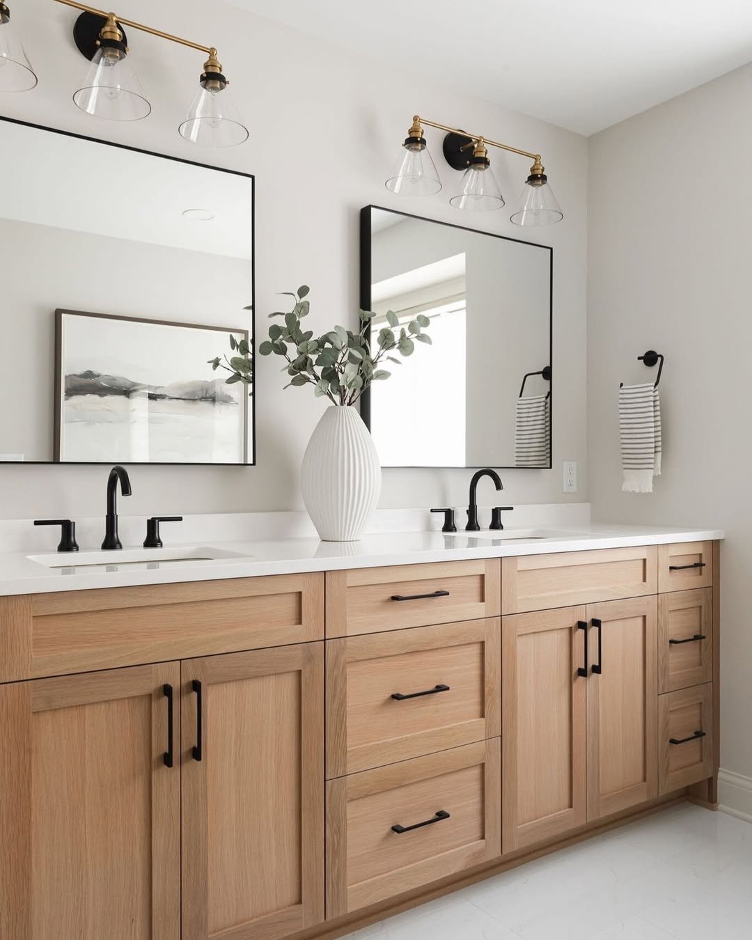 This setup is all about breathing room. Clean lines, light wood cabinetry, and a single statement mirror keep things airy, while a tiny touch of greenery brings life without cluttering the counter.