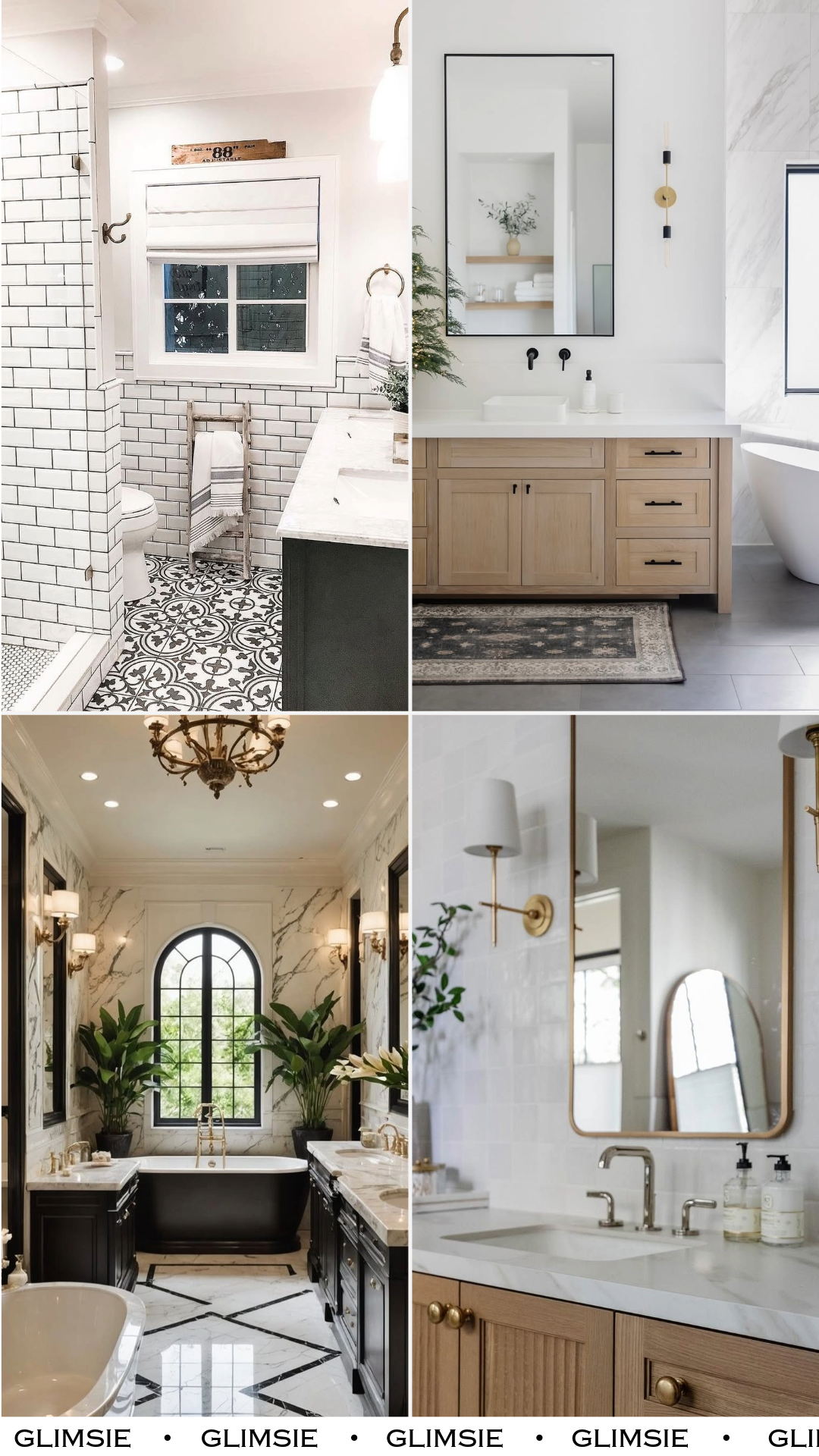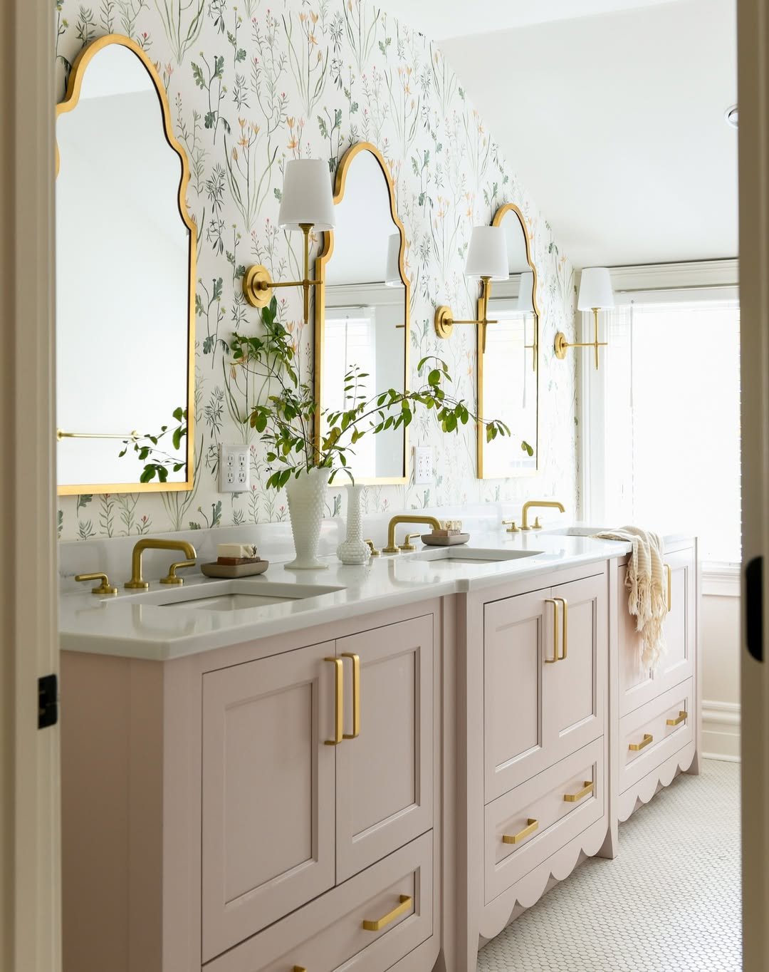 This one feels like a breath of fresh air. The floral wallpaper, gold mirrors, and soft tones create a slightly whimsical vibe, but the countertop decor keeps it grounded—just a touch of greenery and a few neatly placed essentials.