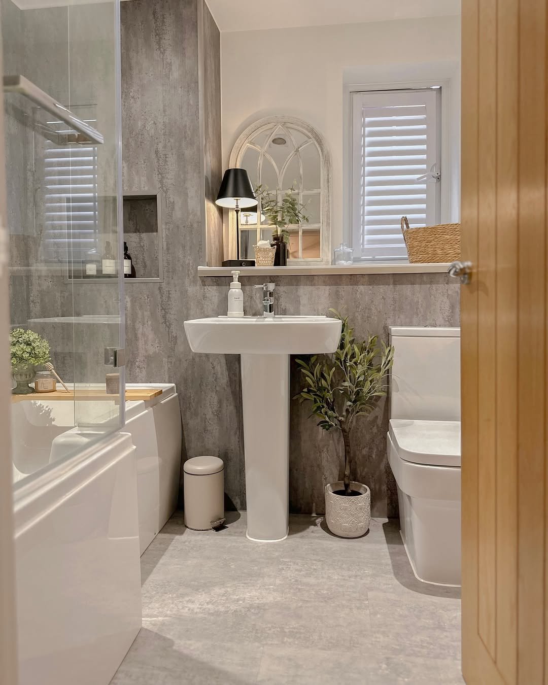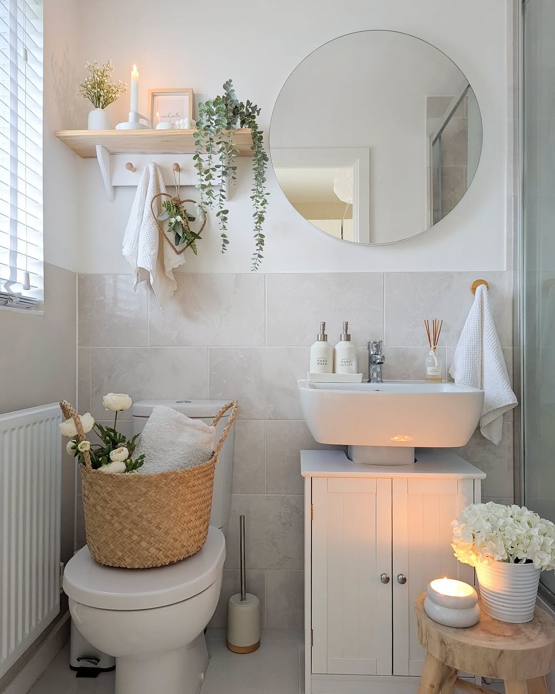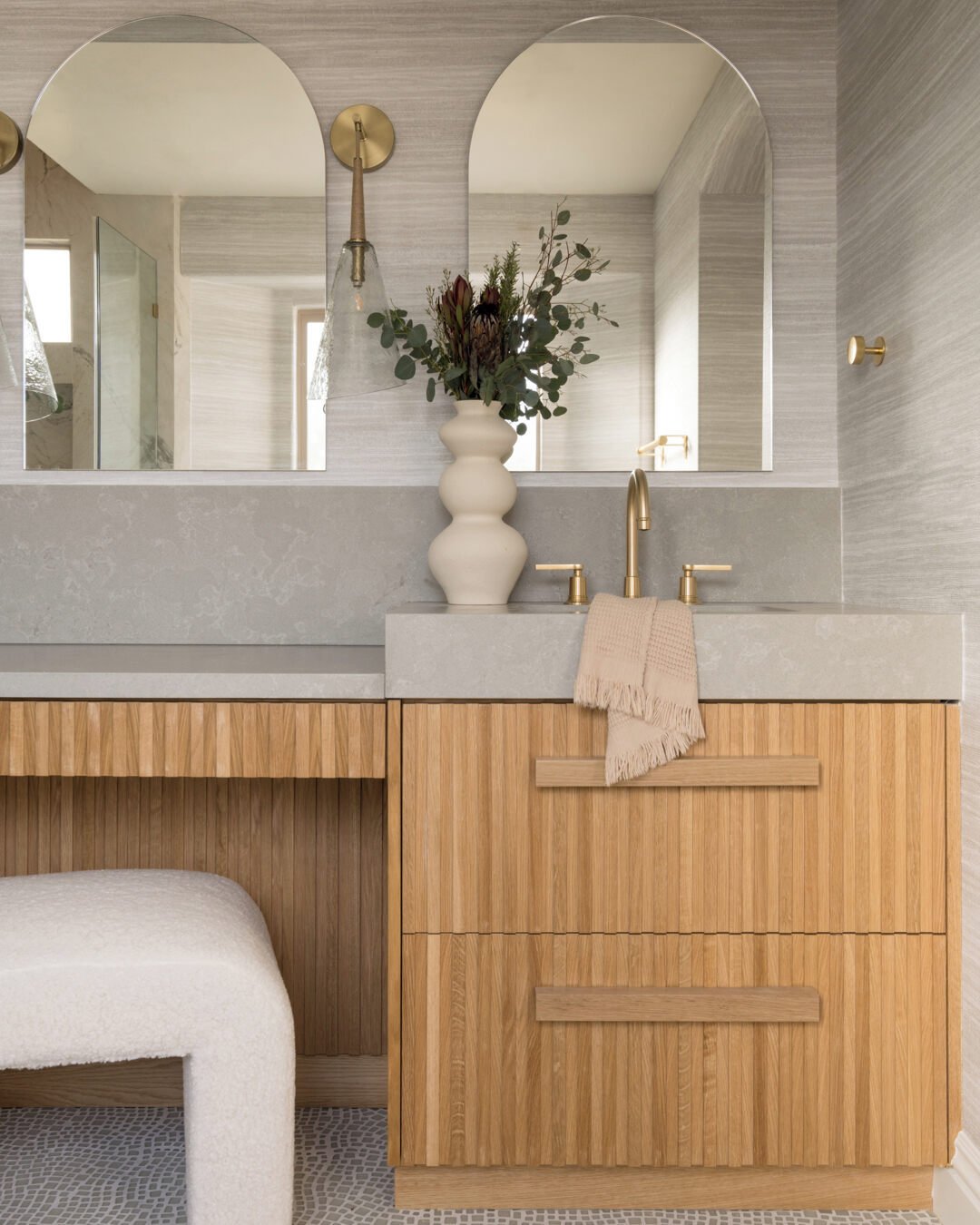 There’s something quietly luxe about this setup. The fluted wood vanity and soft neutral palette already bring texture, so the decor leans into one standout moment—that curvy vase filled with organic greenery.