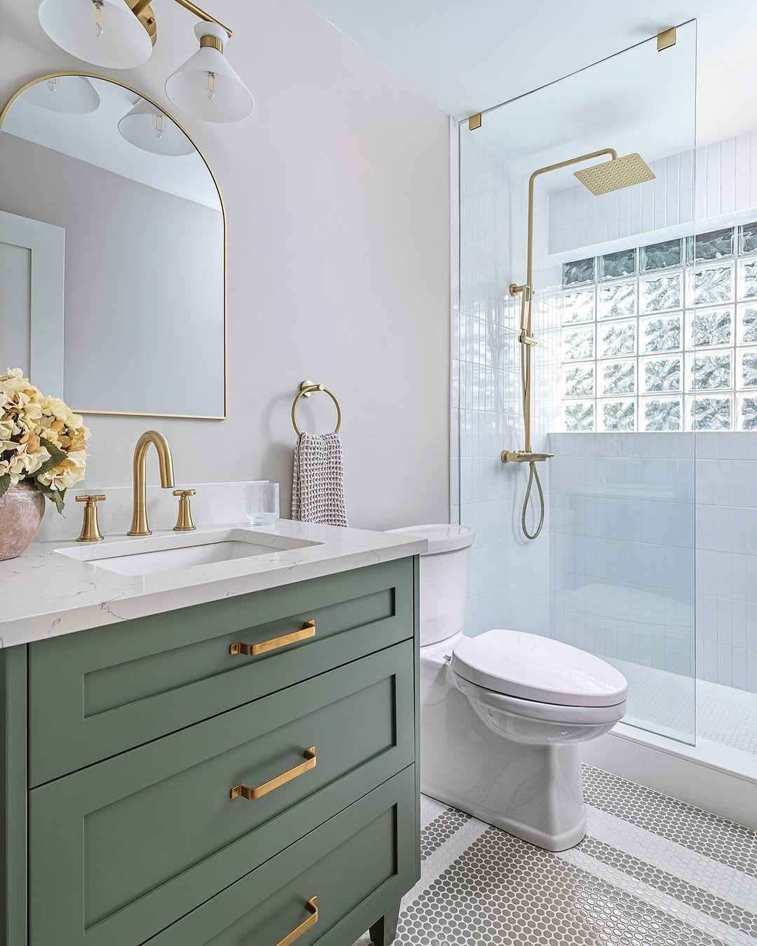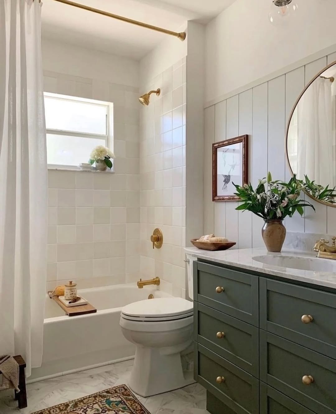 This one is all about the details. The warm brass fixtures paired with crisp marble create a high-end feel, and the decor follows suit—minimal, but refined.