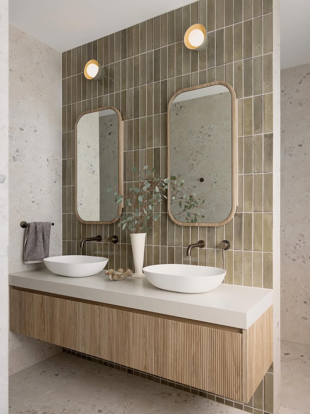 This one feels calm in the most effortless way. The muted green tile, warm wood textures, and soft lighting create a grounded backdrop, while the countertop decor stays beautifully minimal—a single vase with airy greenery and a small sculptural accent.