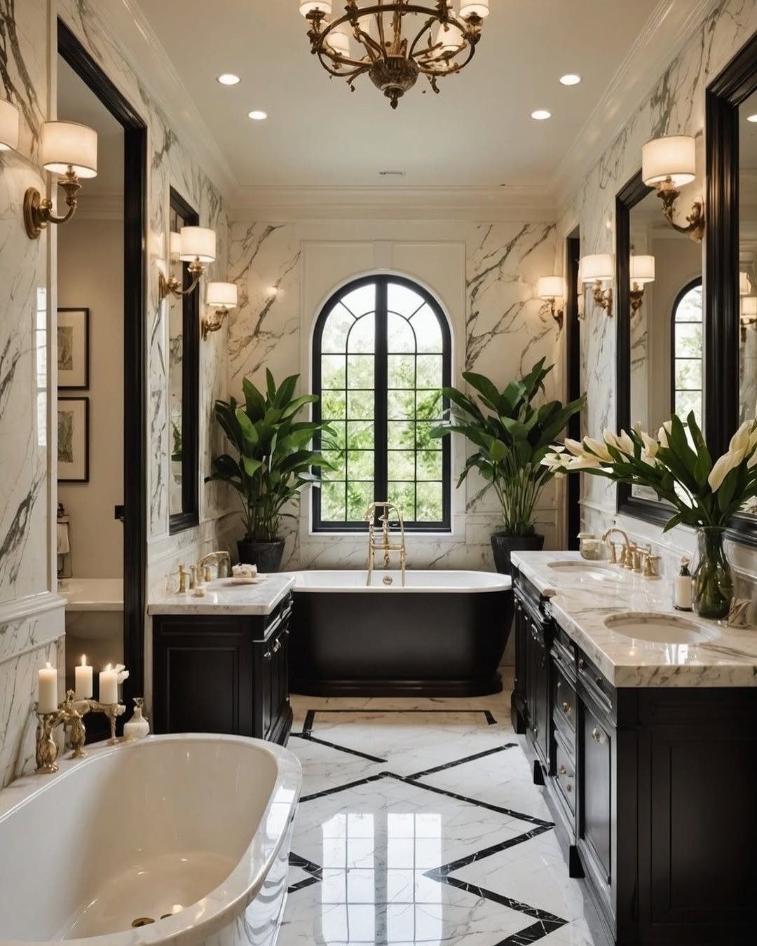 Now this is what you call a polished look. Everything feels balanced—from the double vanities to the perfectly placed decor pieces that frame the space instead of overwhelming it.