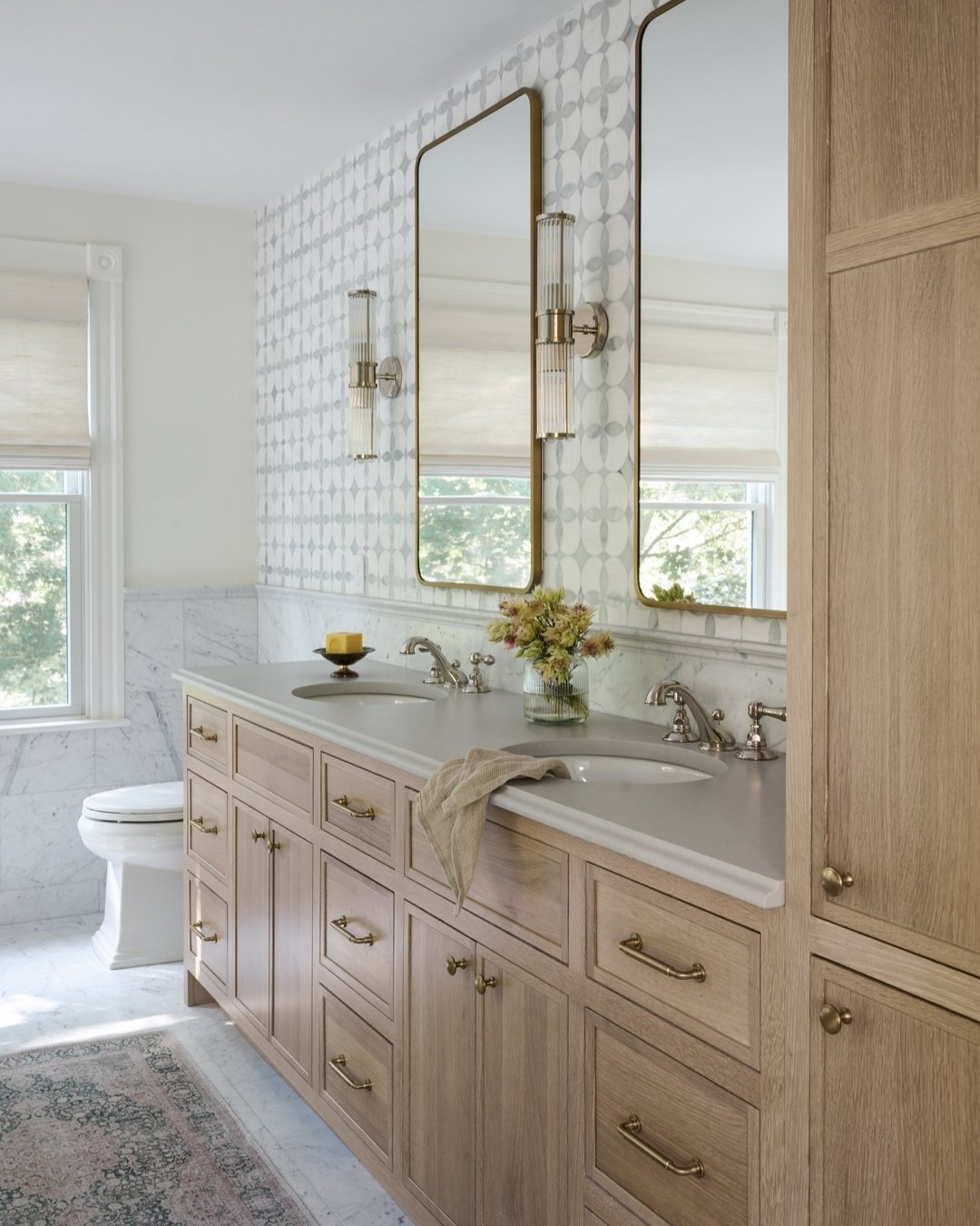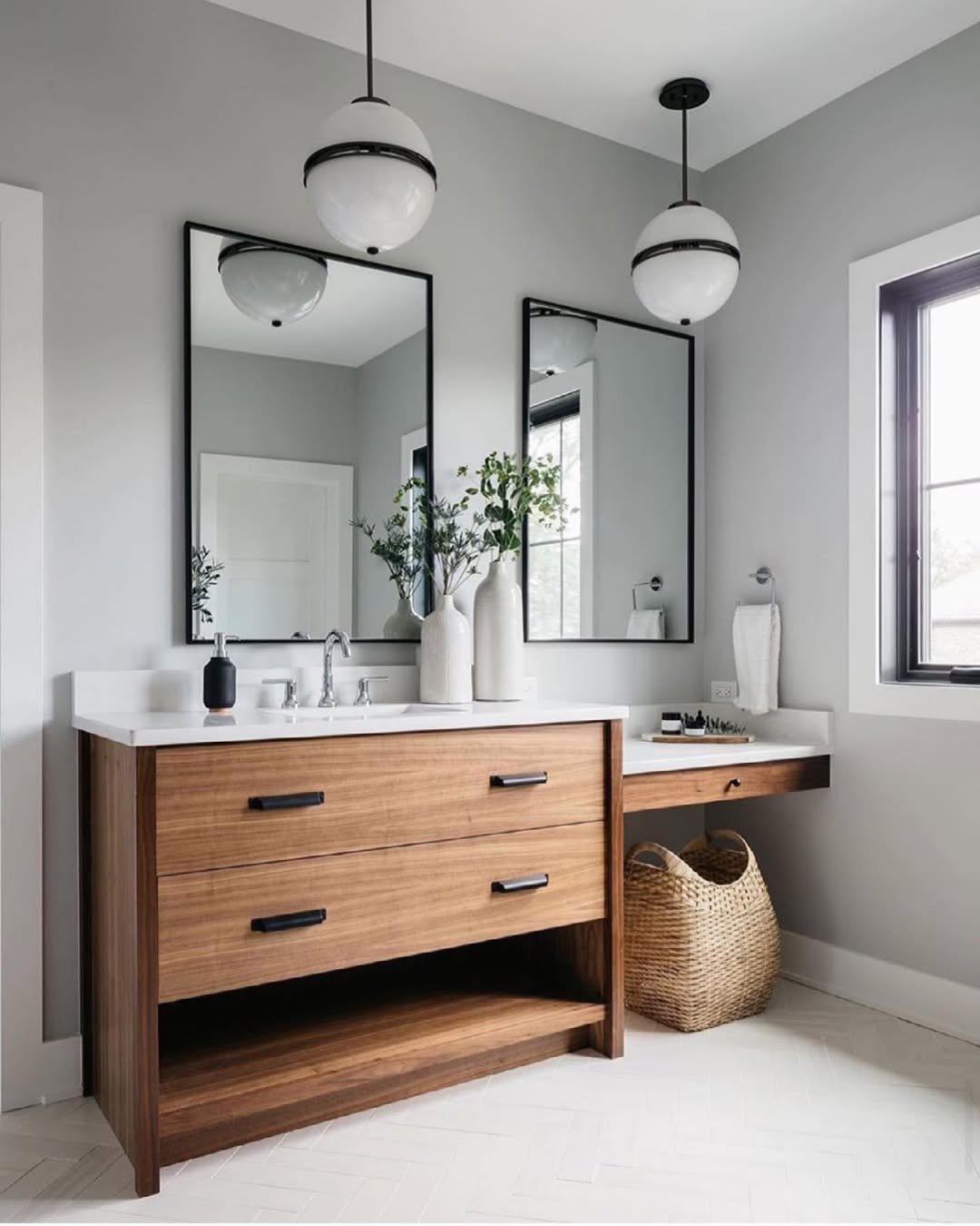 Symmetry strikes again, but this time with a slightly softer, more lived-in feel. Matching mirrors and fixtures keep things structured, while a central decor piece ties everything together.