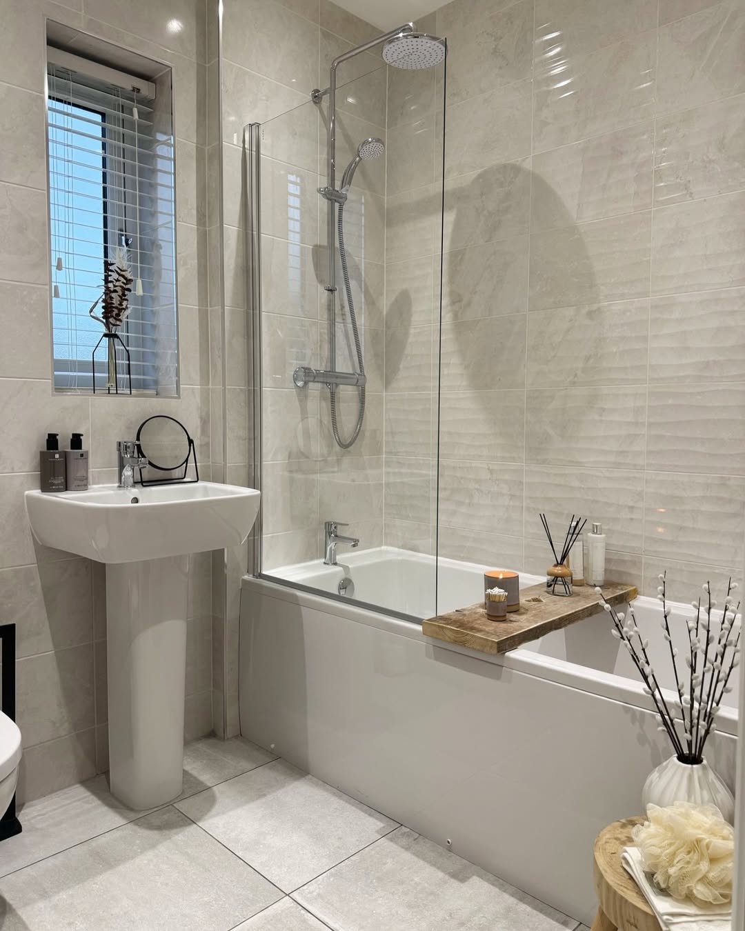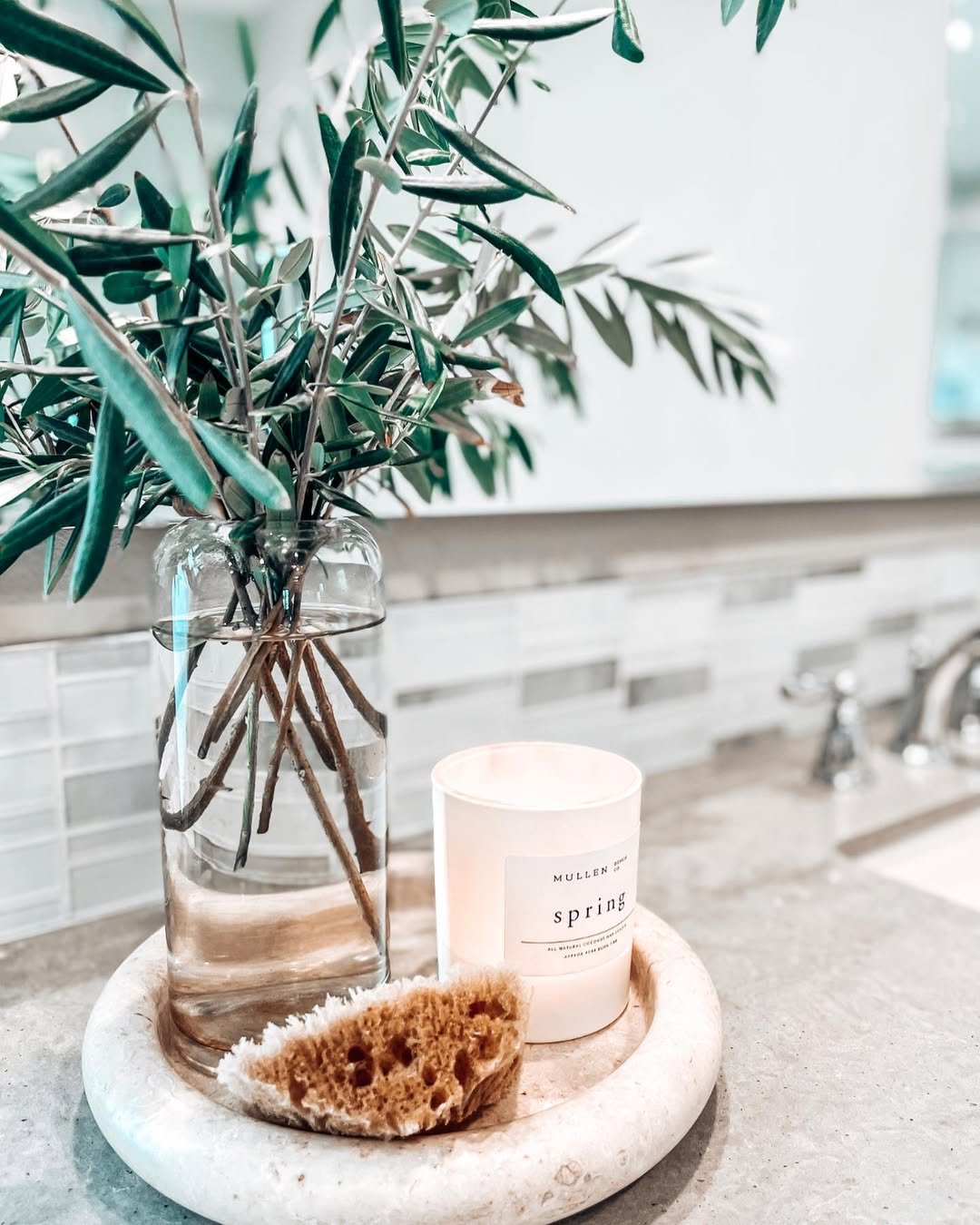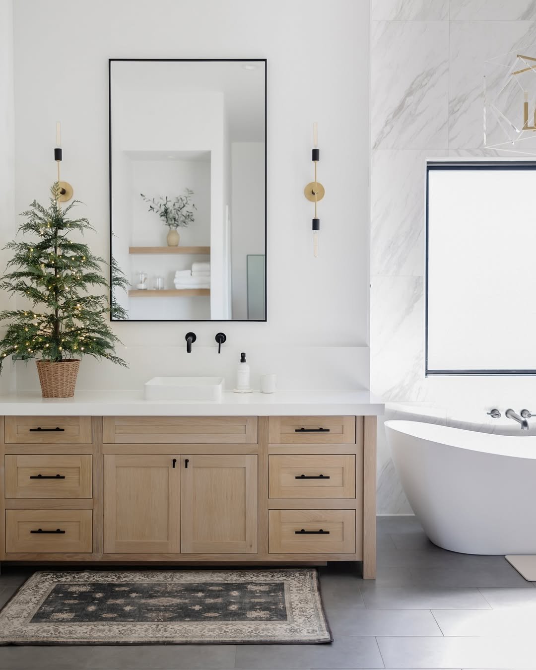 The countertop styling is subtle but elevated: think fresh florals, elegant containers, and a hint of shine. It’s giving “hotel bathroom,” but in the best, most livable way.