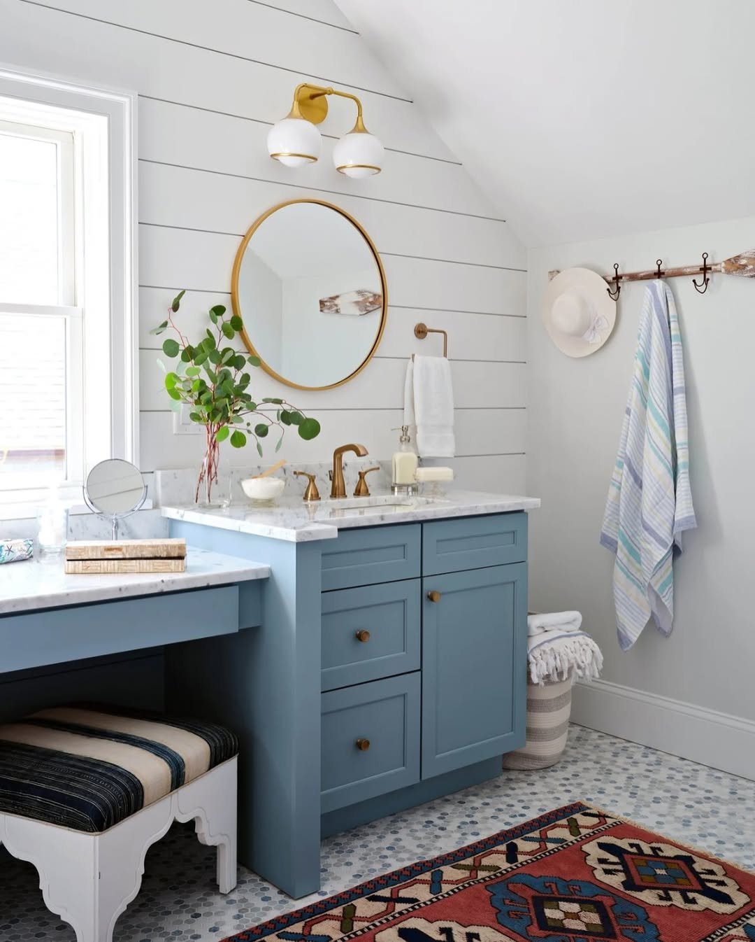 This one feels fresh and relaxed, like a slow Sunday morning. The muted blue vanity paired with light countertops creates a soothing base, while woven textures and greenery add just enough personality.