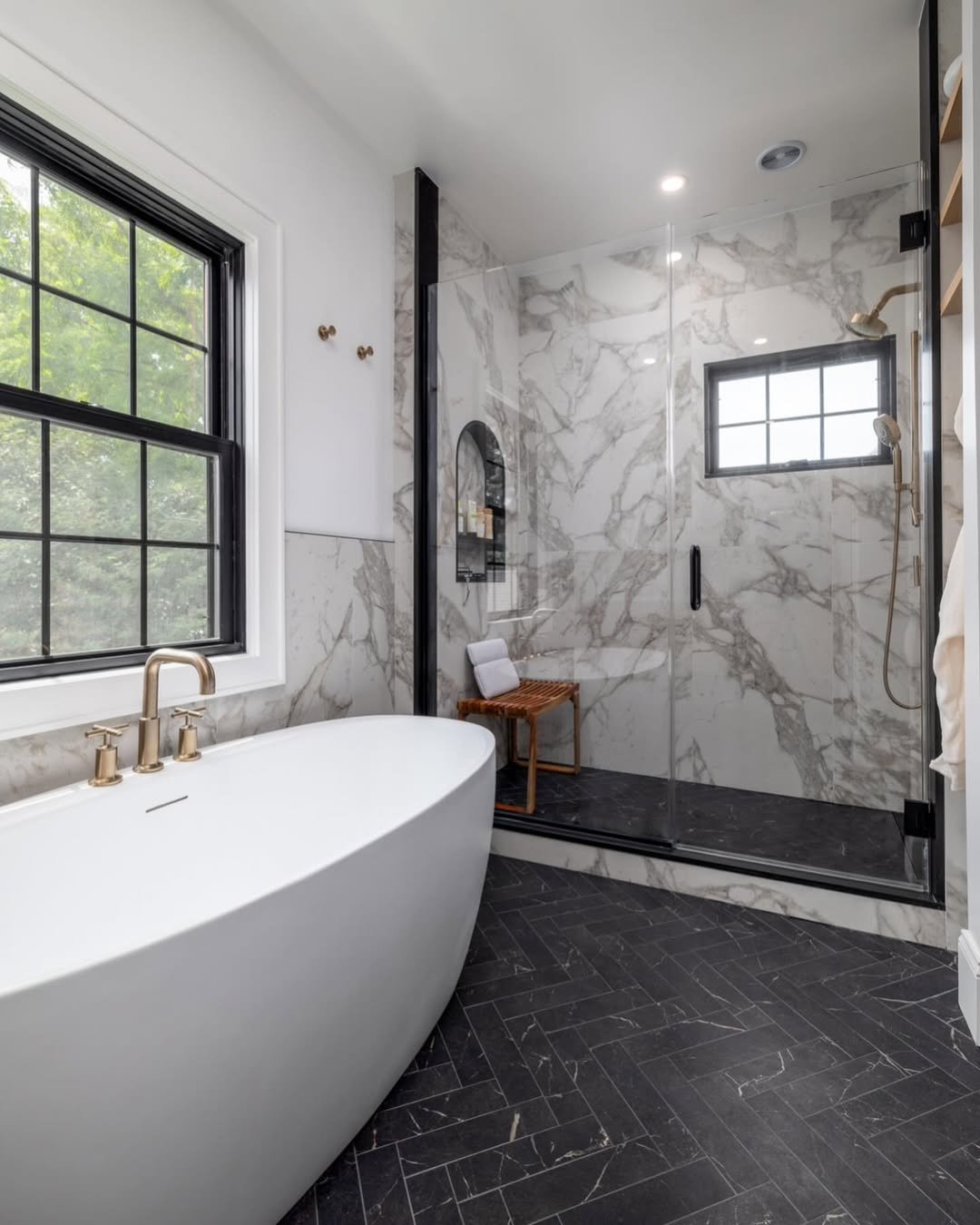 This is drama done properly. The deep black marble flooring with subtle veining creates a striking contrast against the crisp white tub and walls. It’s bold, but it still feels refined—not overpowering.