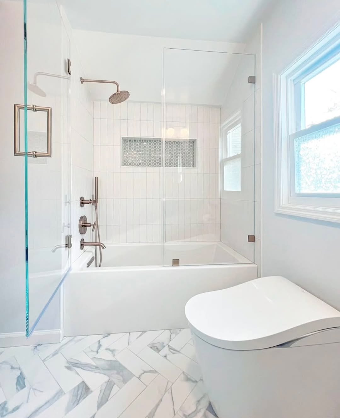 Ending on a clean, modern note. This marble-look flooring keeps everything light, bright, and seamless, especially paired with that glass shower and soft gray veining.