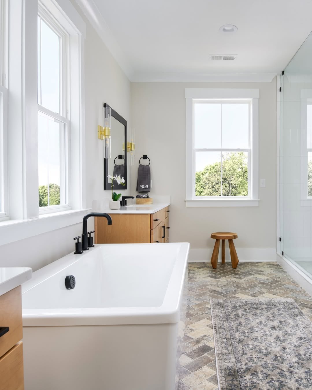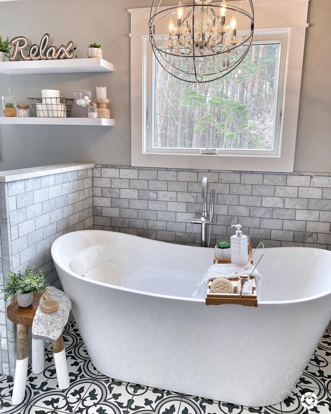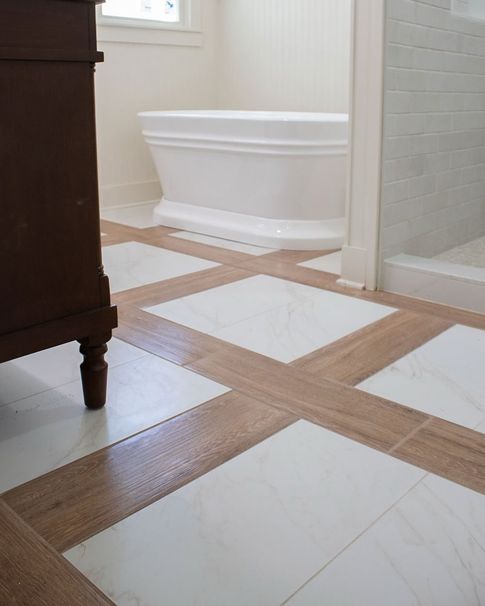 This floor is doing exactly what a great bathroom floor should—making a statement without taking over. The patterned tiles bring in personality and a bit of vintage charm, especially paired with that freestanding tub and soft neutrals.
