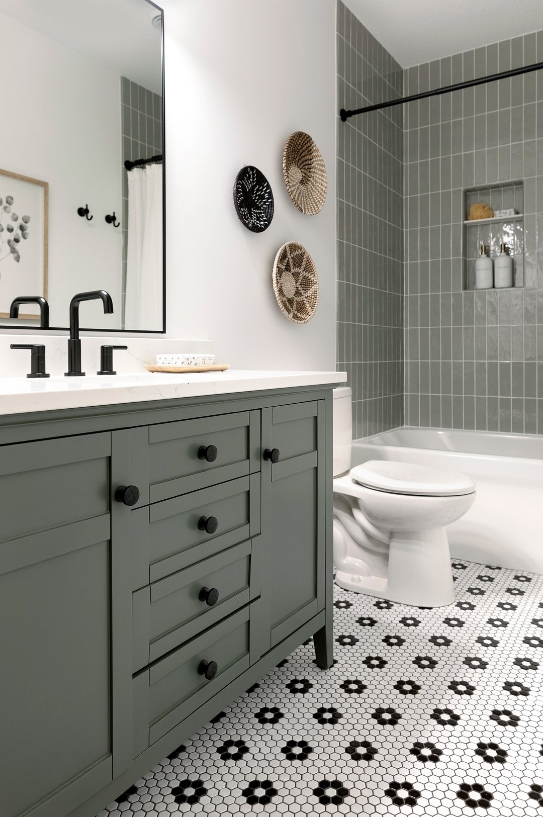 At first glance, it’s classic hex tile—but then those little black accents pull you in. It adds just enough pattern to break up the white, giving the floor a bit of rhythm without stealing the spotlight from that gorgeous green vanity.