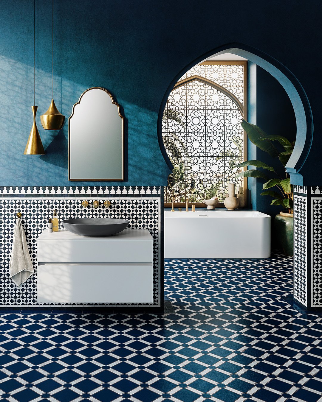 This is where things get dramatic—in a good way. The bold geometric pattern in deep blue creates a rich, almost regal vibe, especially paired with those gold accents and architectural details.