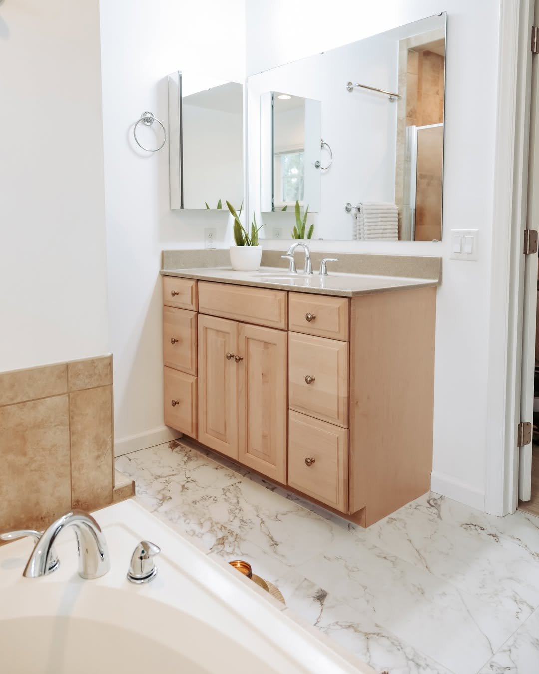 Now this is where things get a little elevated. That marble-style flooring instantly adds depth and movement, giving the bathroom a more high-end, custom feel. Pairing it with warm wood cabinetry keeps it from feeling too formal or overdone.