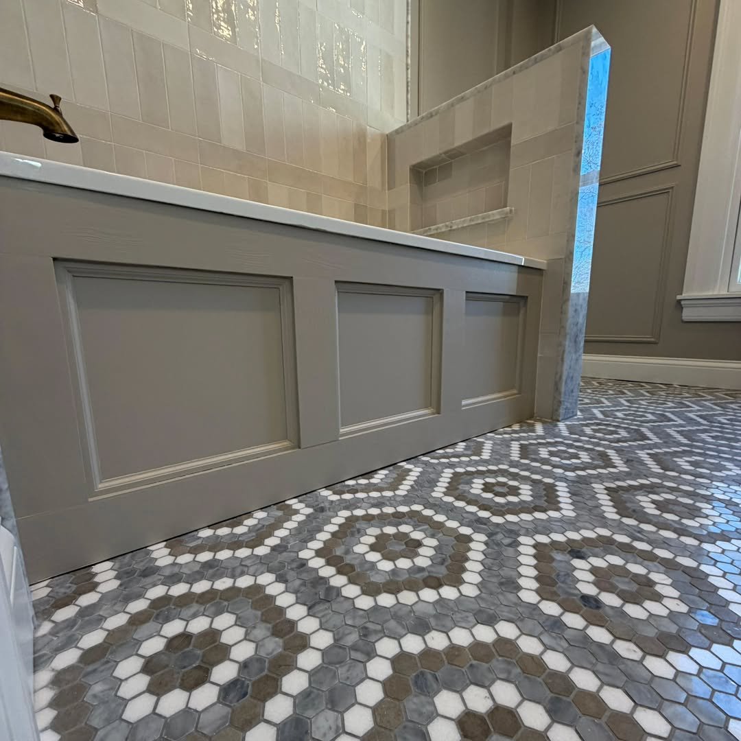 This flooring leans into detail, and it pays off. The small-scale mosaic pattern creates texture and depth, making the space feel more custom and thoughtfully designed.
