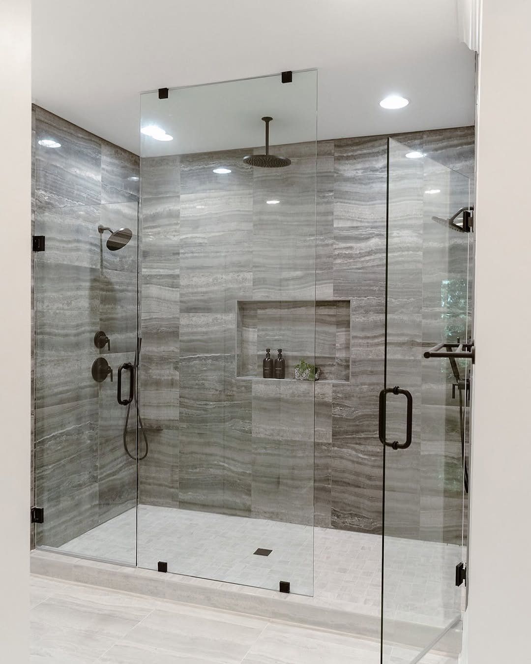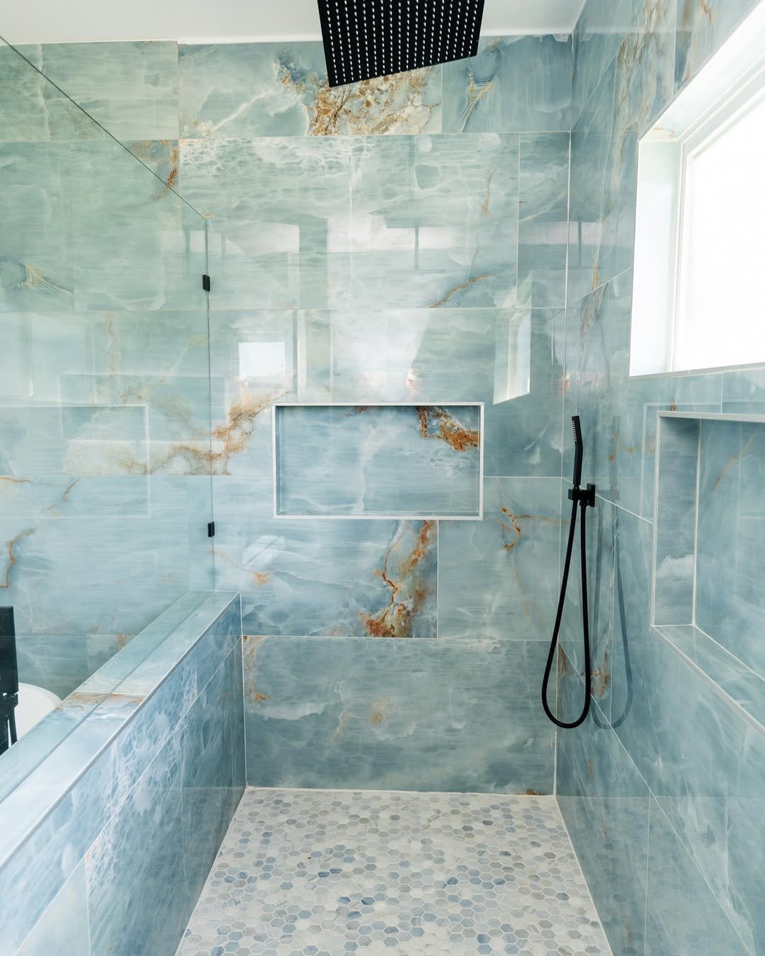 Okay, this one’s a showstopper. The blue-toned stone effect feels almost like flowing water, turning the entire shower into a statement moment. And pairing it with smaller hex tiles on the floor keeps things balanced and textured.
