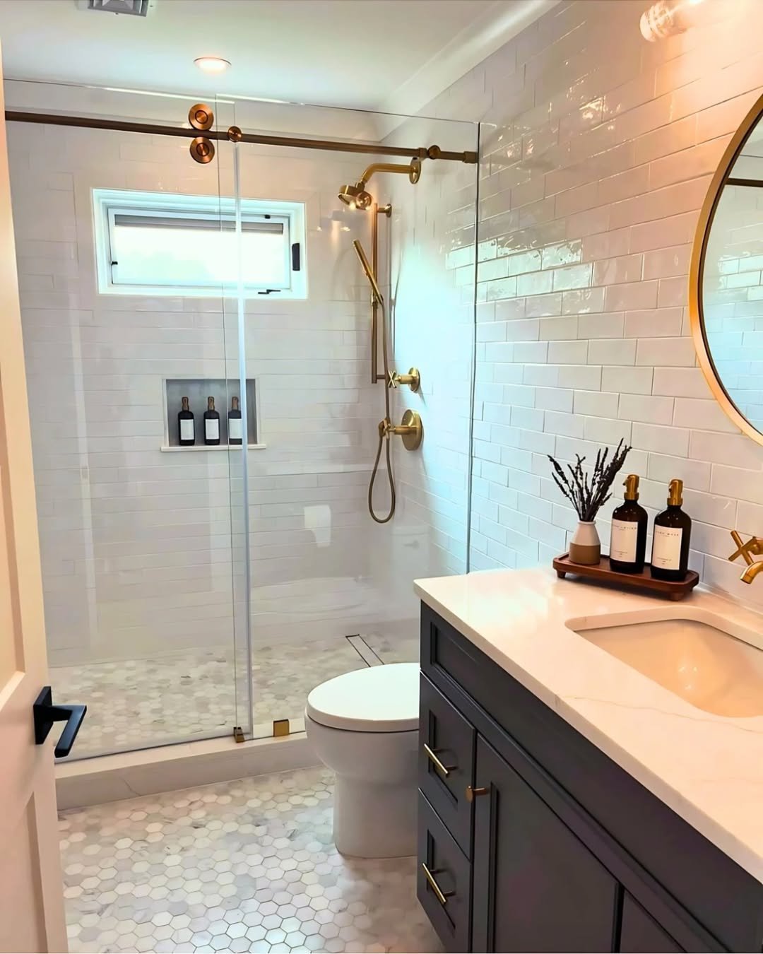 Hex tiles are a forever favorite, and this black-and-white version proves why. The pattern adds visual interest without overwhelming the space, and it pairs beautifully with the crisp white cabinetry.