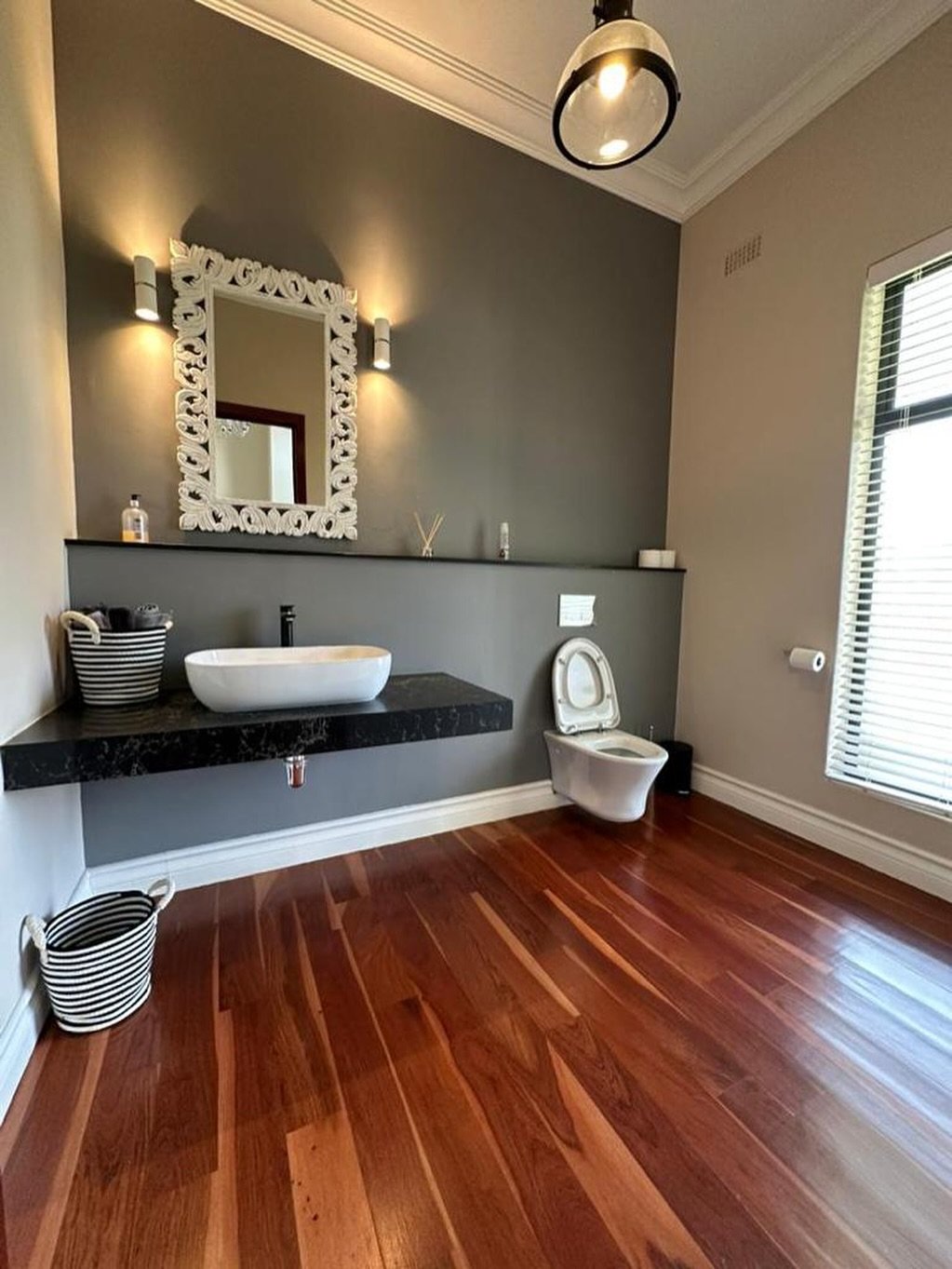 Now this is unexpected—in the best way. That rich wood flooring brings a deep warmth that instantly makes the bathroom feel more like a living space than a purely functional one.