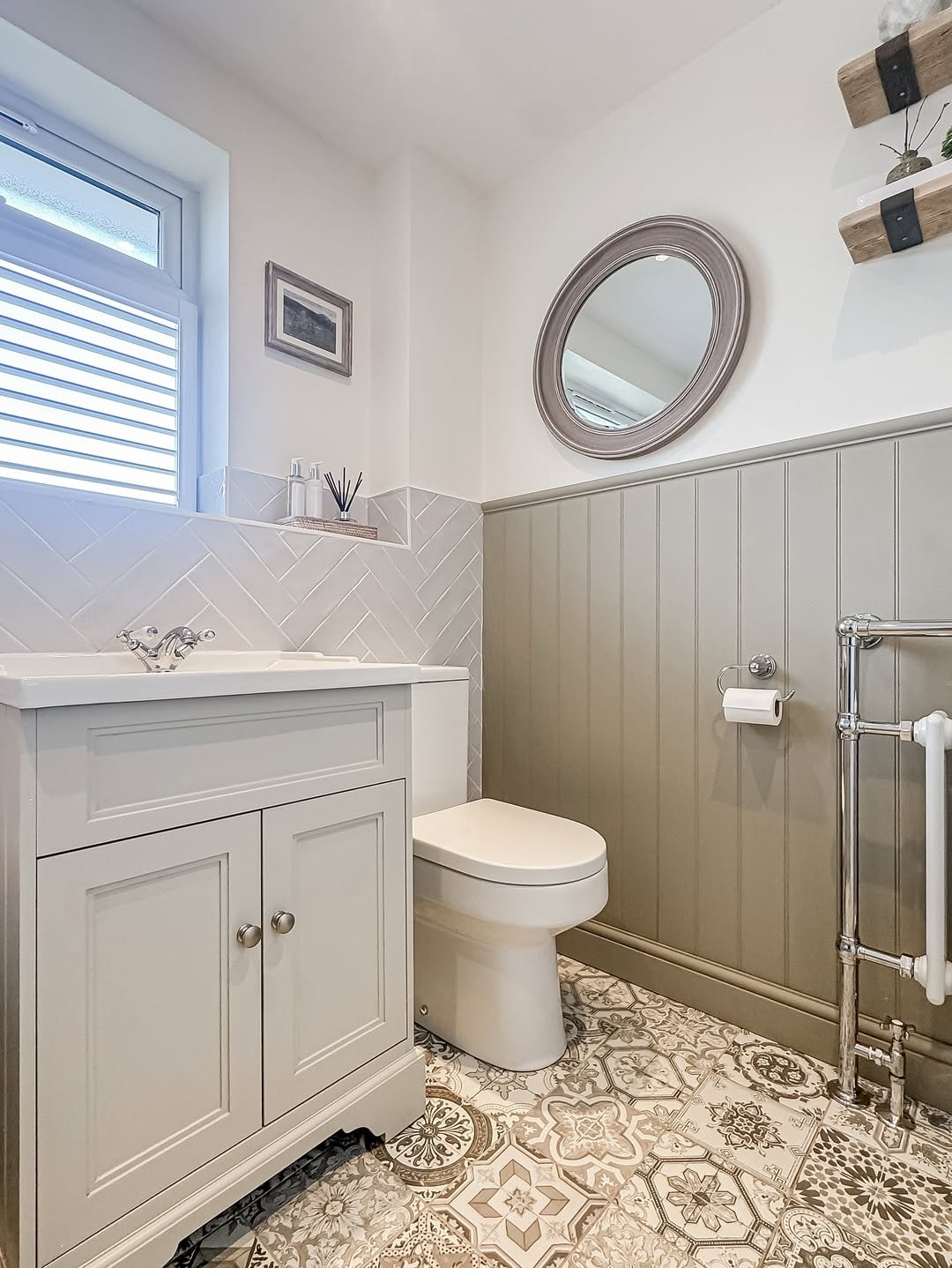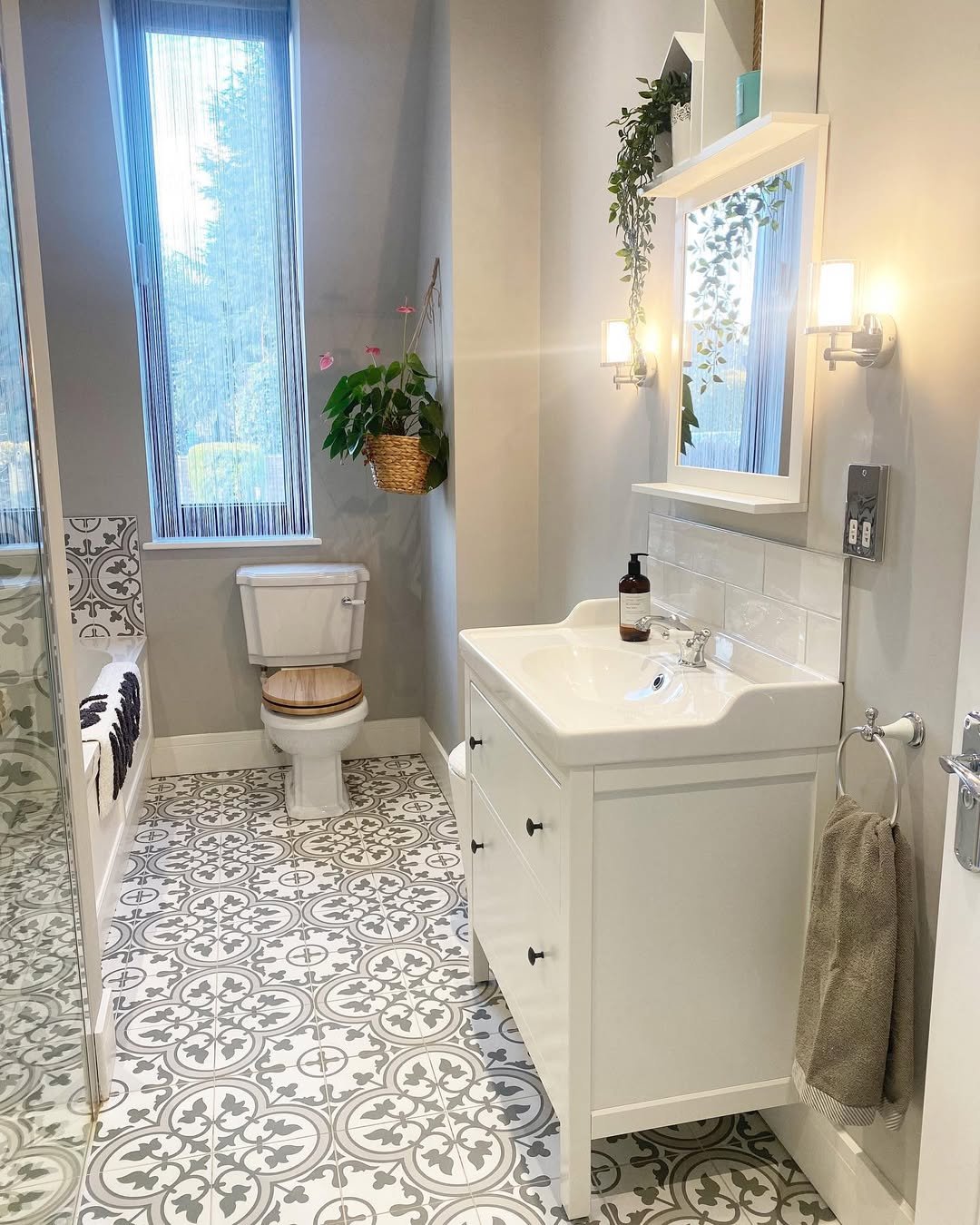 Ending on a bold note—this patterned tile floor brings serious character. It has that vintage-inspired charm that instantly gives the bathroom personality, especially when paired with natural wood and greenery.