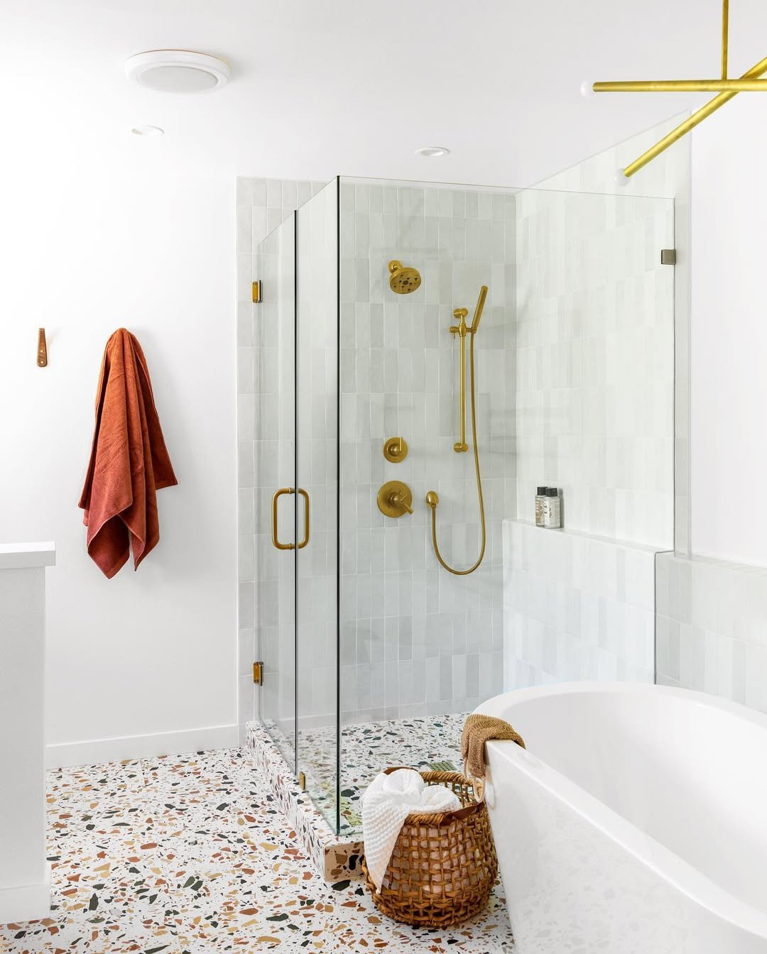 Terrazzo flooring is having a moment, and this space shows why. The speckled pattern adds texture and fun, breaking up all the white in a way that feels modern and fresh. Bonus points for the gold fixtures tying everything together.