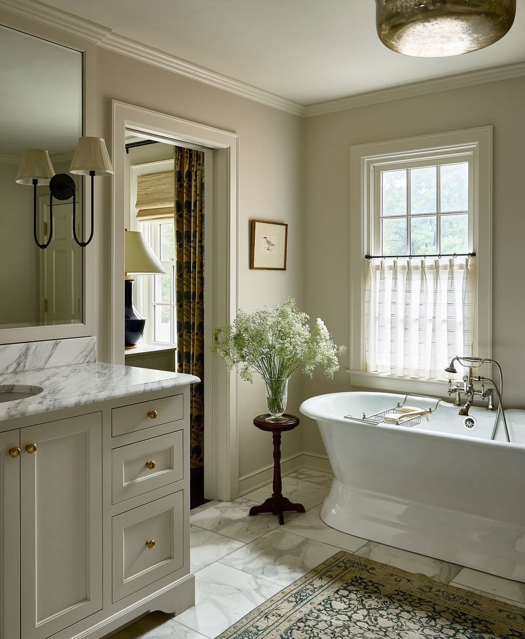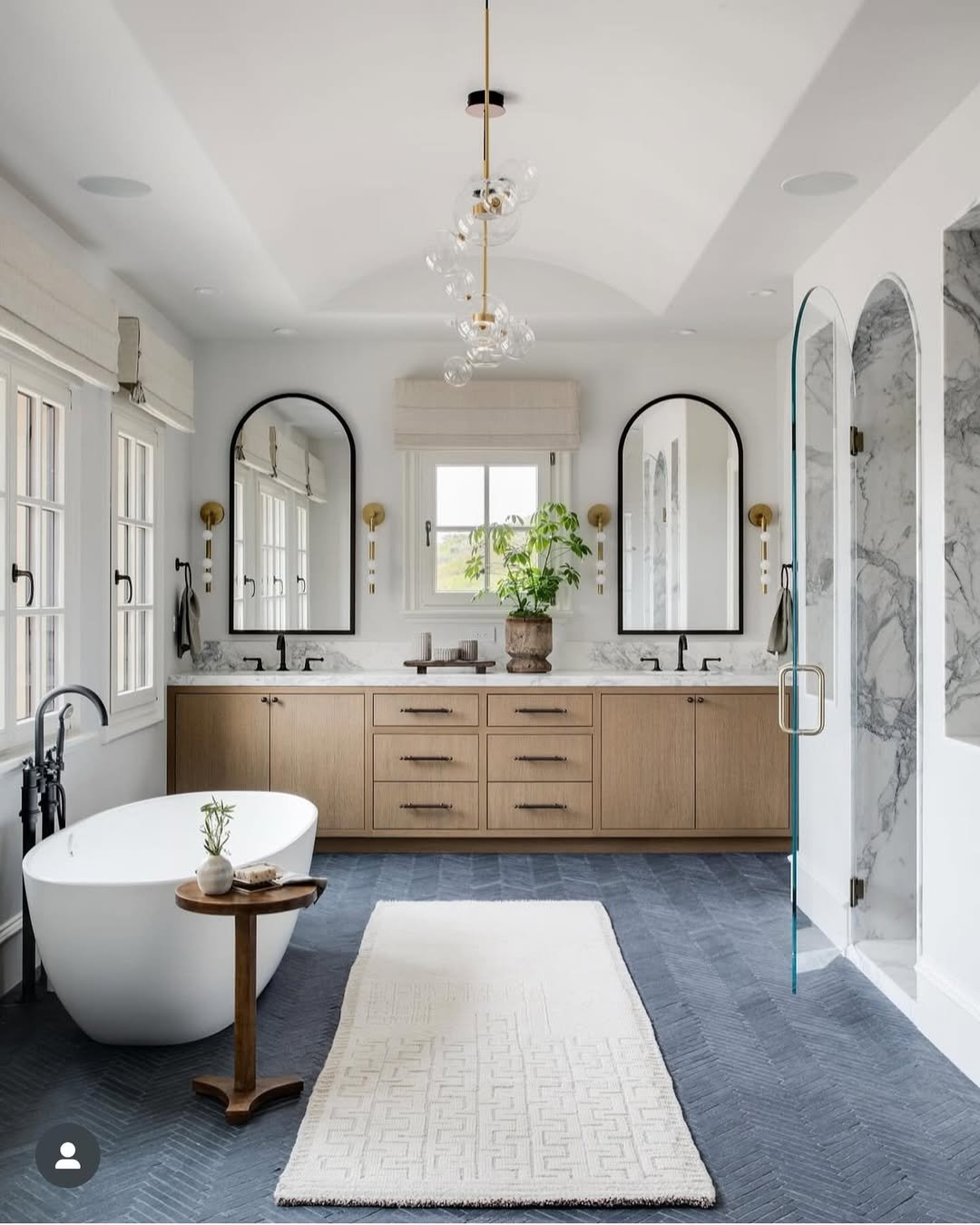 There’s something about this one that feels like a slow morning. The freestanding tub, soft textures, and layered neutrals make it feel almost spa-like.