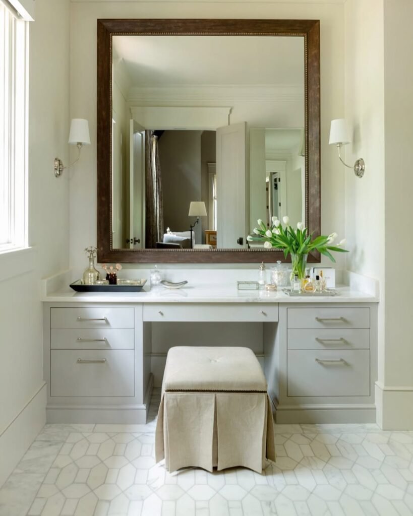 This one is giving full luxury. The extended vanity with a built-in seating area feels like a bathroom-meets-dressing-room situation.