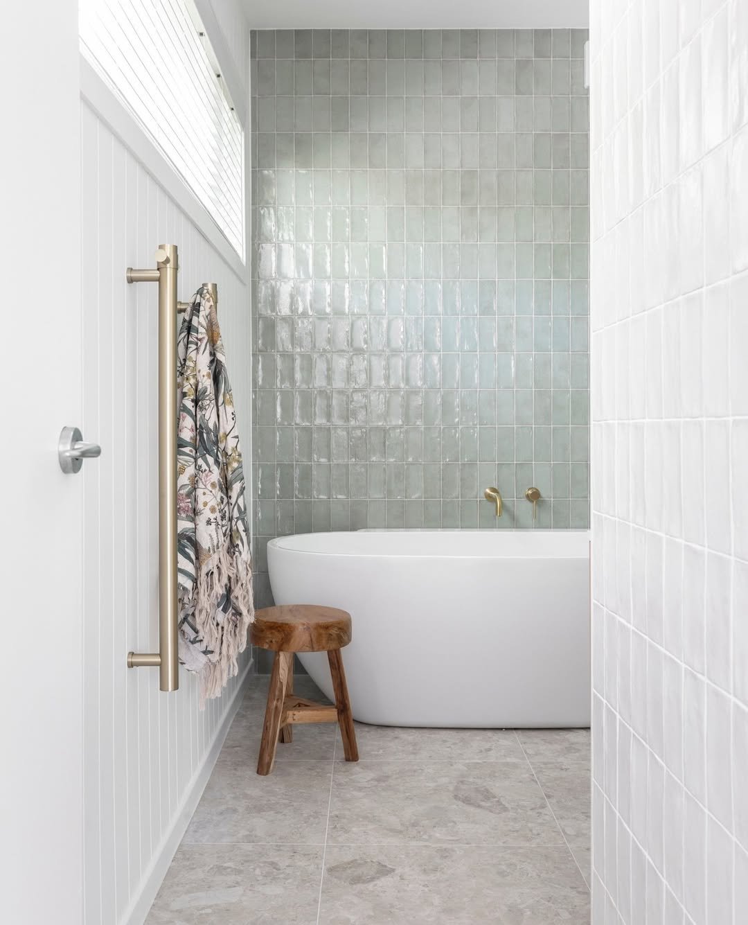 Small space, big payoff. The tub nook feels like a mini retreat, with soft tiles and just the right amount of warmth from the wood stool.