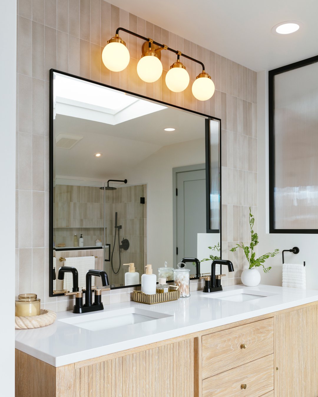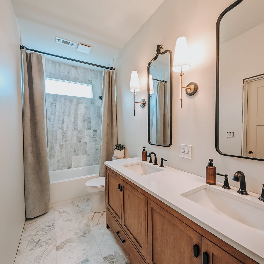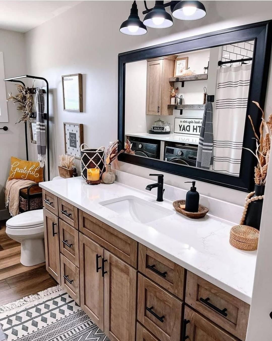 This space leans into that cozy, lived-in charm. The wood vanity, black hardware, and oversized mirror create a look that feels both practical and styled.
