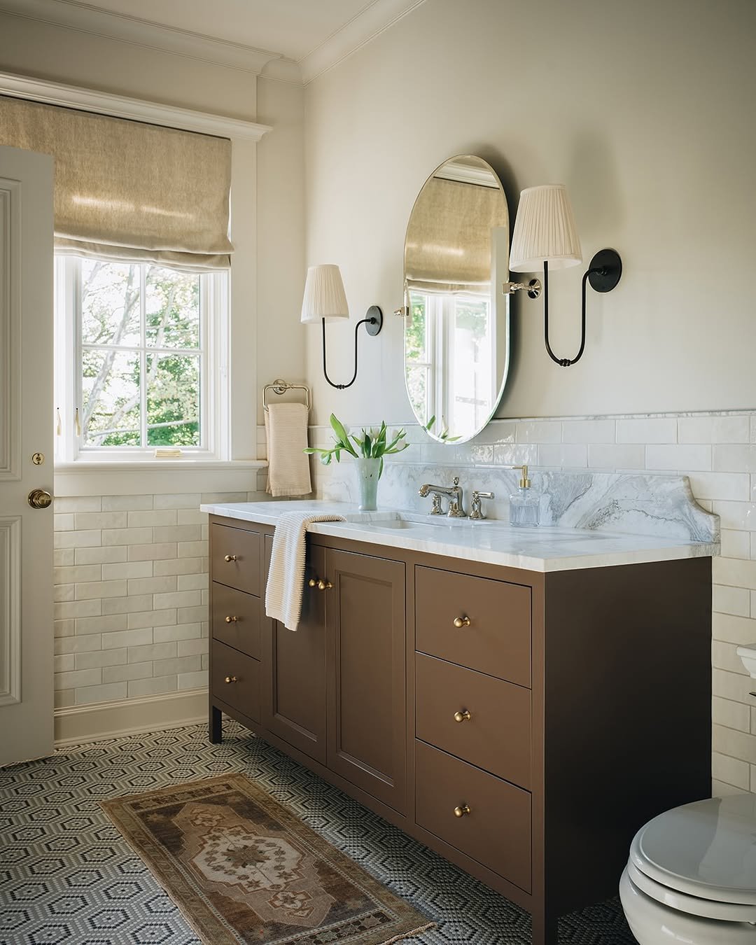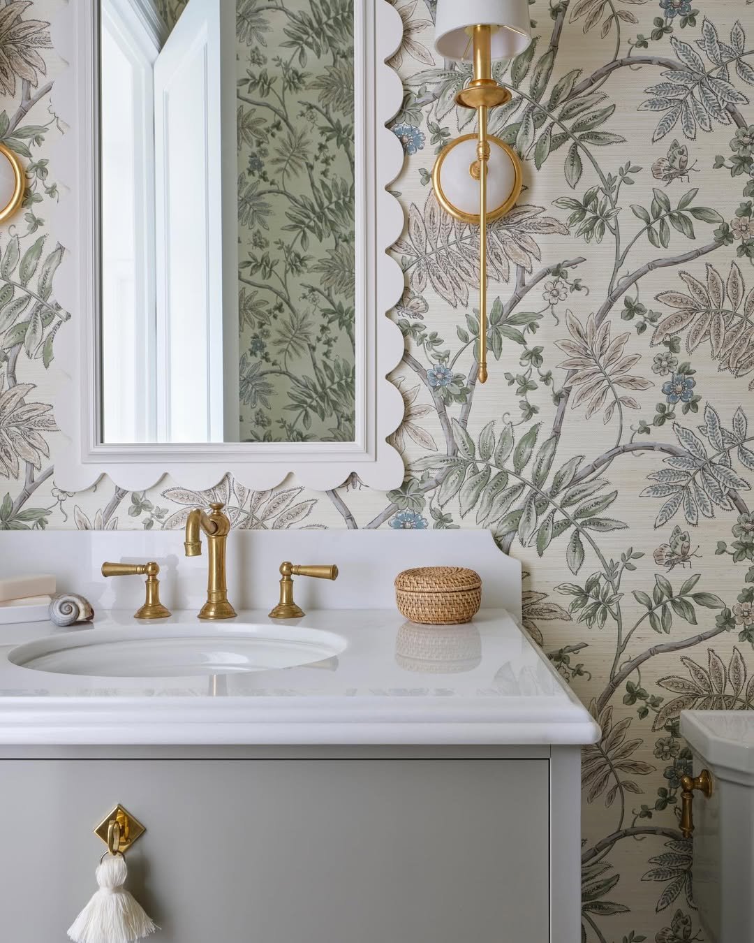 This one leans into charm in such a soft, pretty way. The wallpaper brings all the personality, while the crisp white vanity keeps everything balanced.