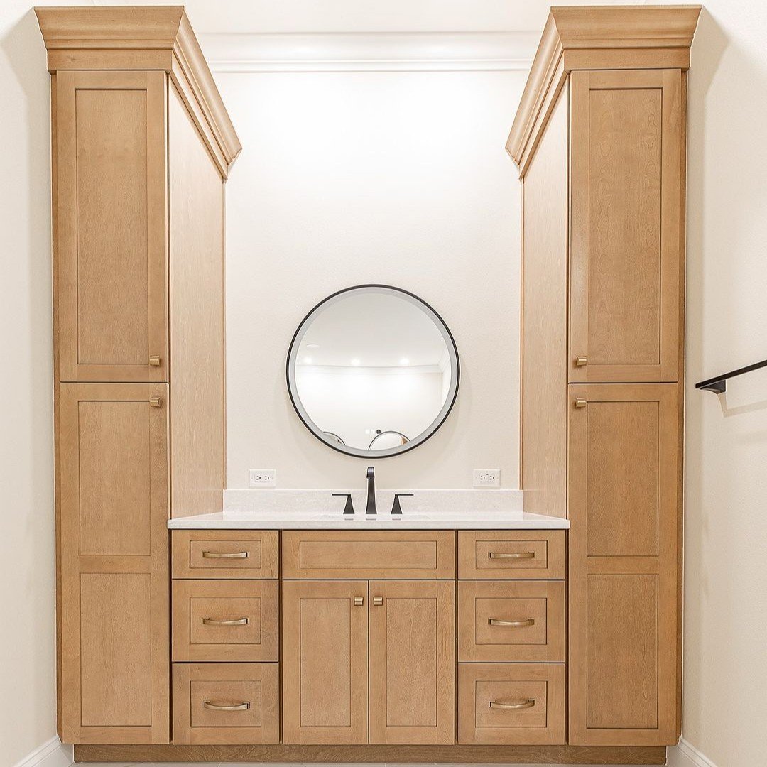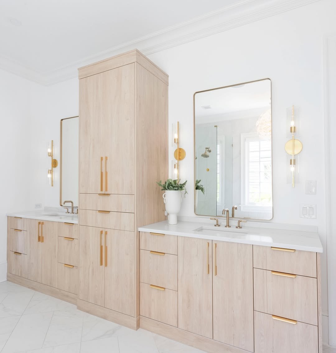 And the light wood with brass pulls? It feels fresh, airy, and just polished enough. It’s giving “custom home energy” without trying too hard.