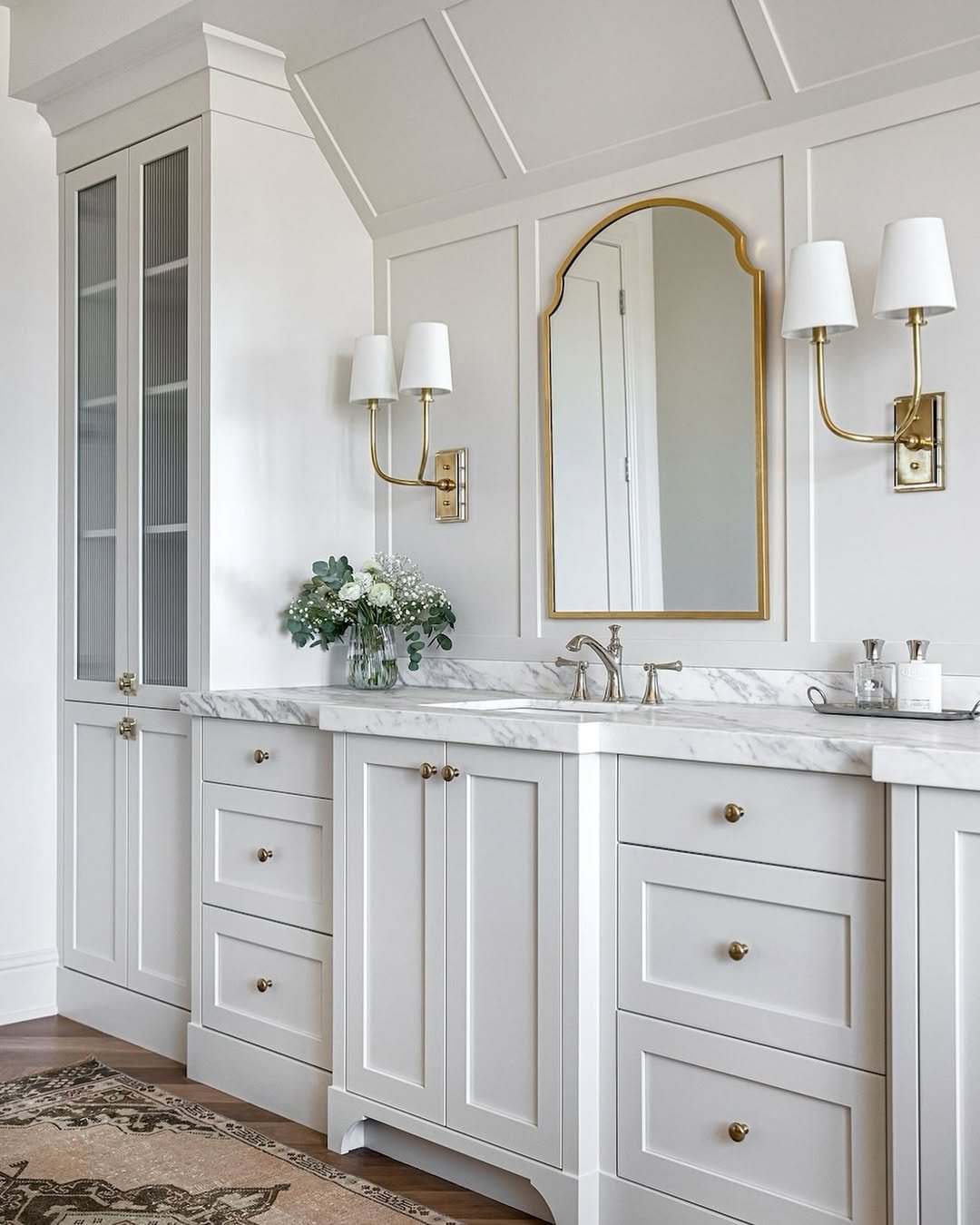 This one feels like stepping into a calm, polished morning. The light gray cabinetry, marble surfaces, and those warm brass accents all come together in a way that feels quietly elevated.