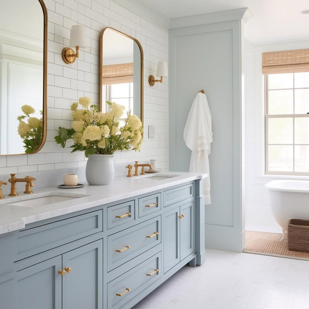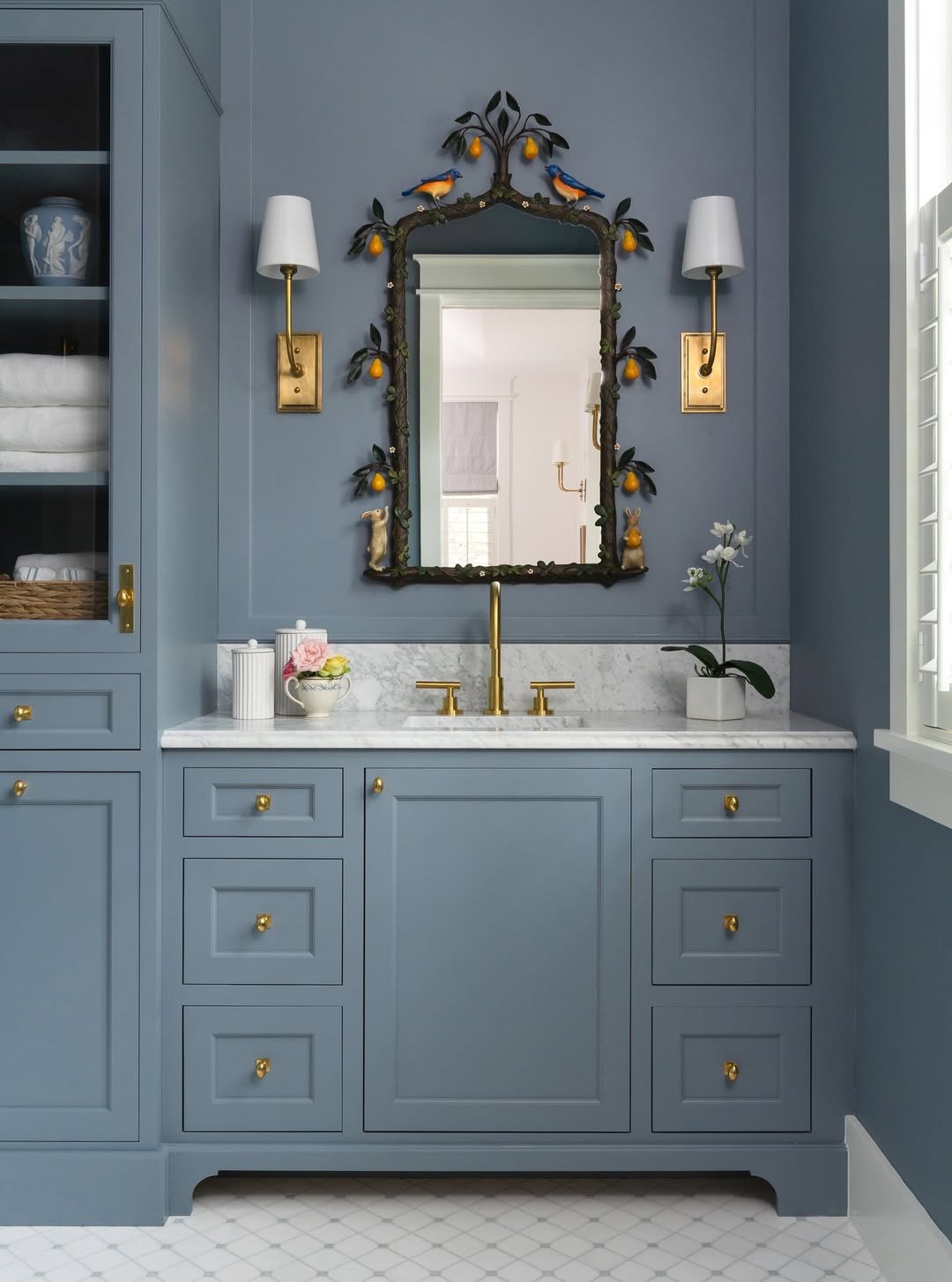 That muted blue vanity is the star here. It adds just enough color to keep things interesting while still feeling calm and easy on the eyes.