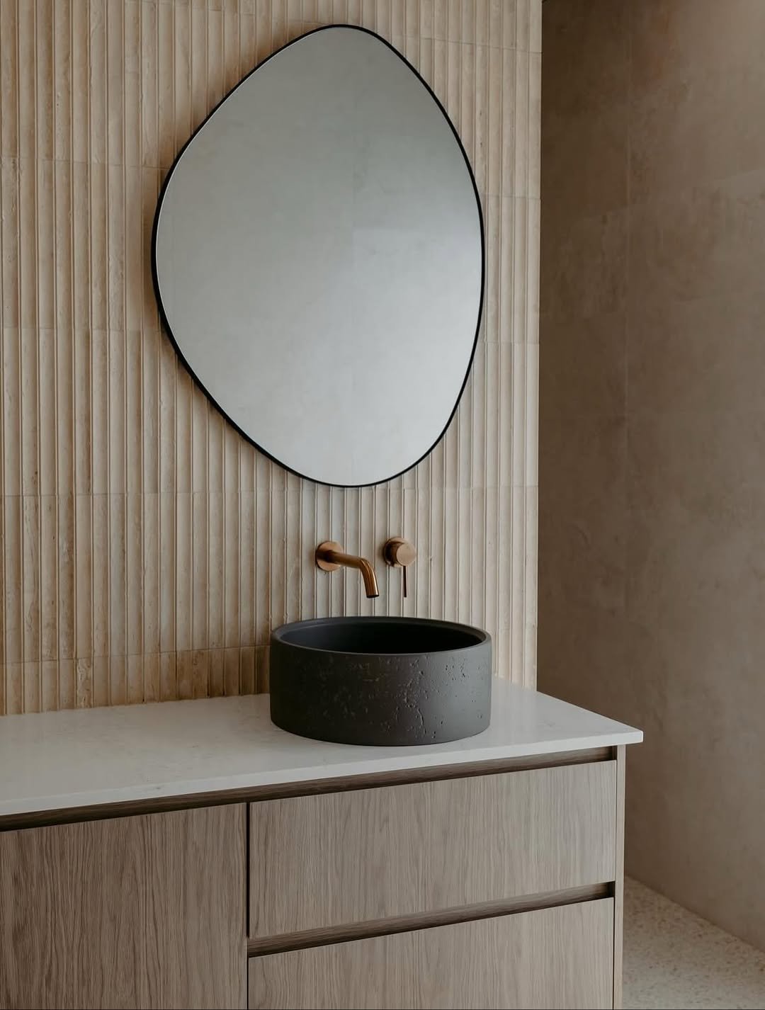 There’s something so satisfying about this perfectly balanced setup. Double mirrors, clean lines, and that long wooden vanity that grounds the whole space without making it feel heavy.