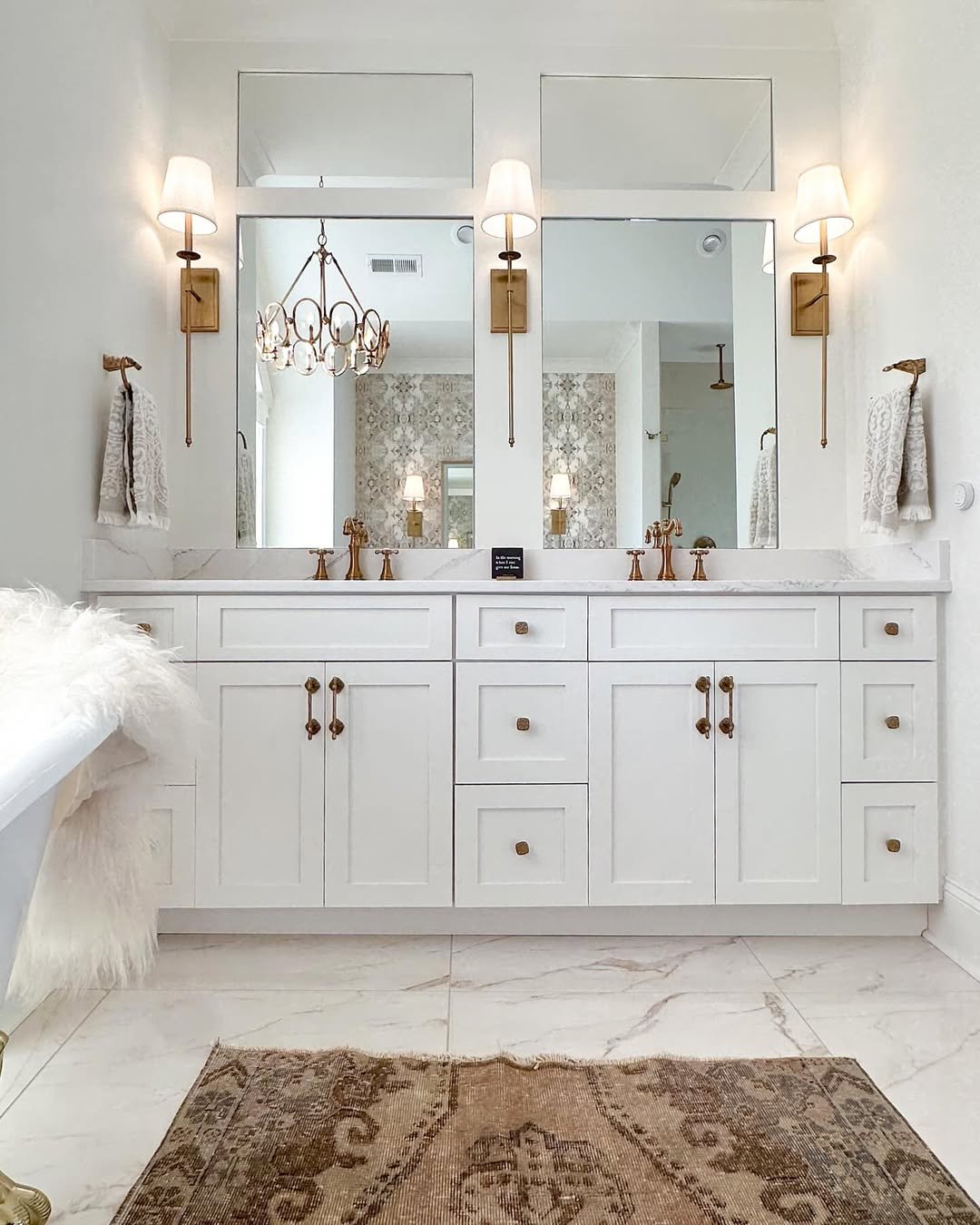 Soft white cabinetry, classic hardware, and those warm-toned fixtures—it’s giving timeless in the best way. Nothing feels trendy, but everything feels right.