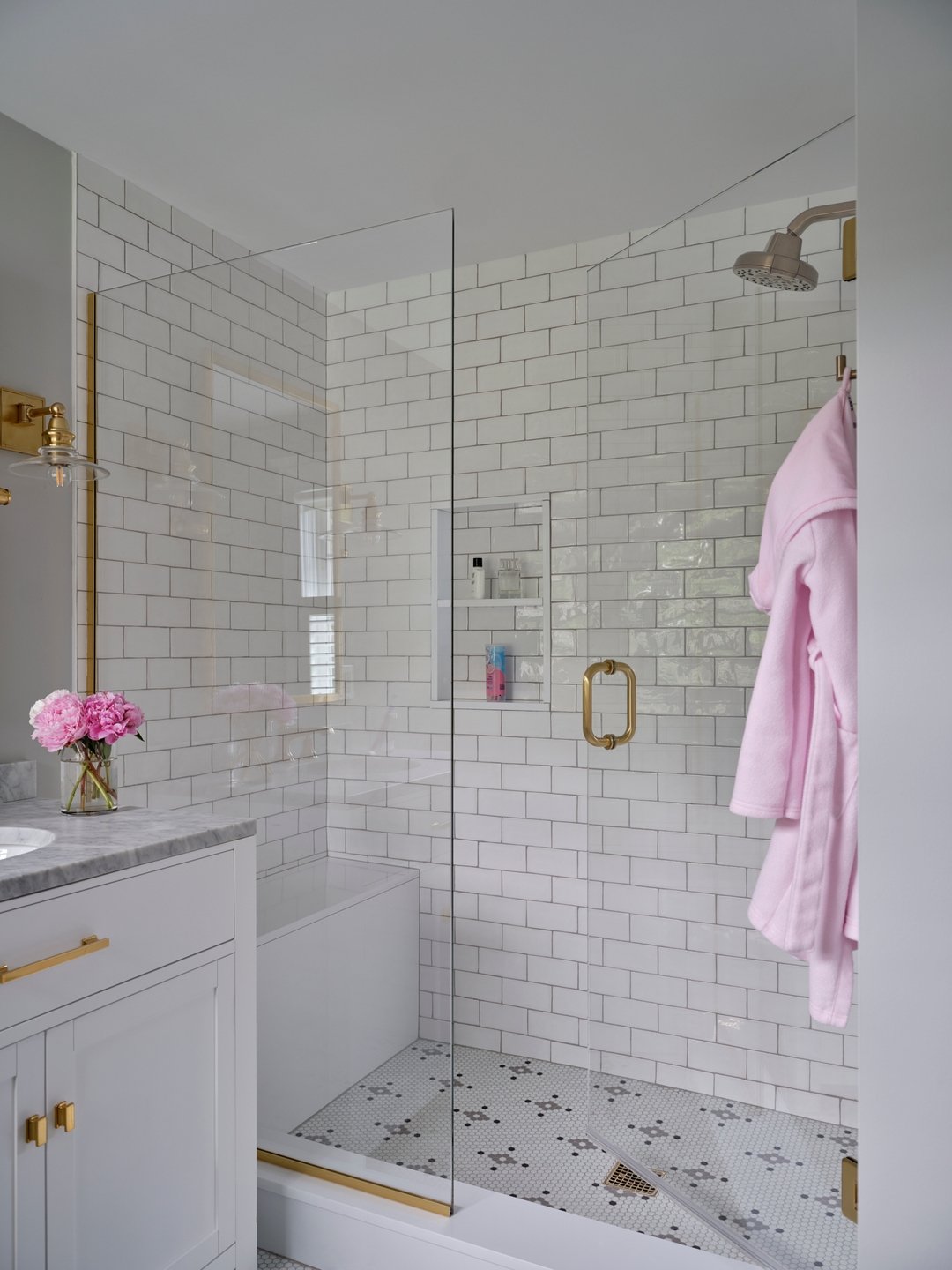 The built-in niches are the real MVP here. Practical, yes—but also styled just enough to feel intentional. It’s the kind of bathroom that makes your 5-minute shower turn into a full “don’t rush me” situation.