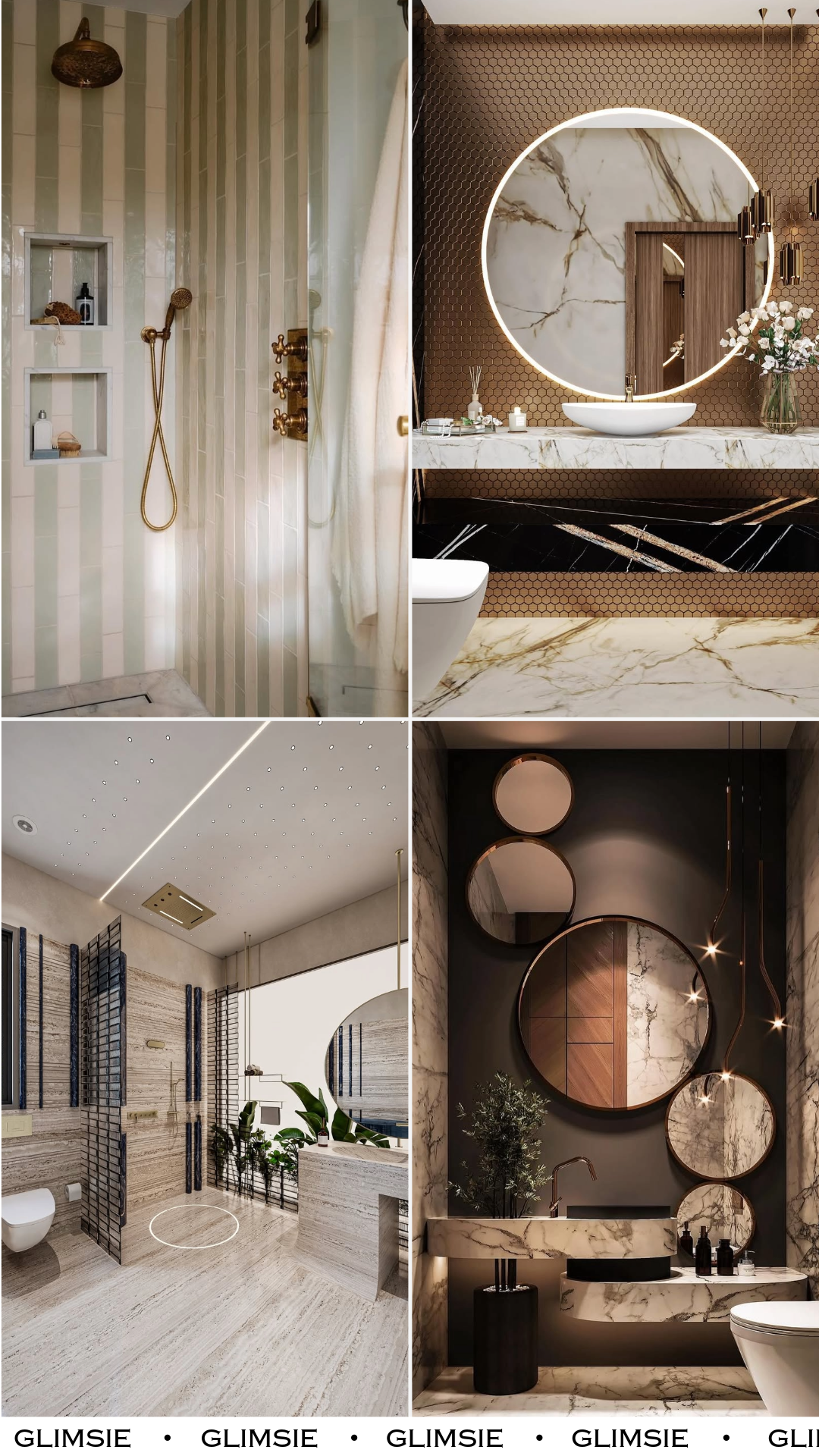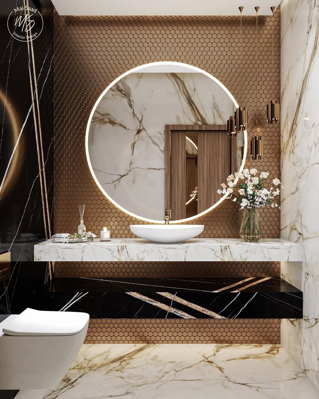 This one is pure drama—in the best way. That honeycomb gold wall paired with bold marble veining is already a power move, but then you add the glowing circular mirror and suddenly it feels like a luxury hotel suite you never want to leave.