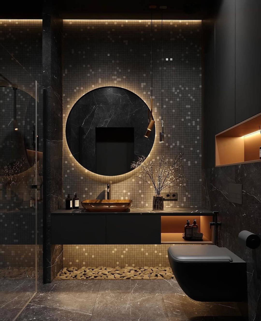 The pebble detail under the vanity adds texture and surprise, while the warm lighting keeps it from feeling too heavy. It’s bold, immersive, and honestly a little addictive—you wouldn’t rush out of this one.