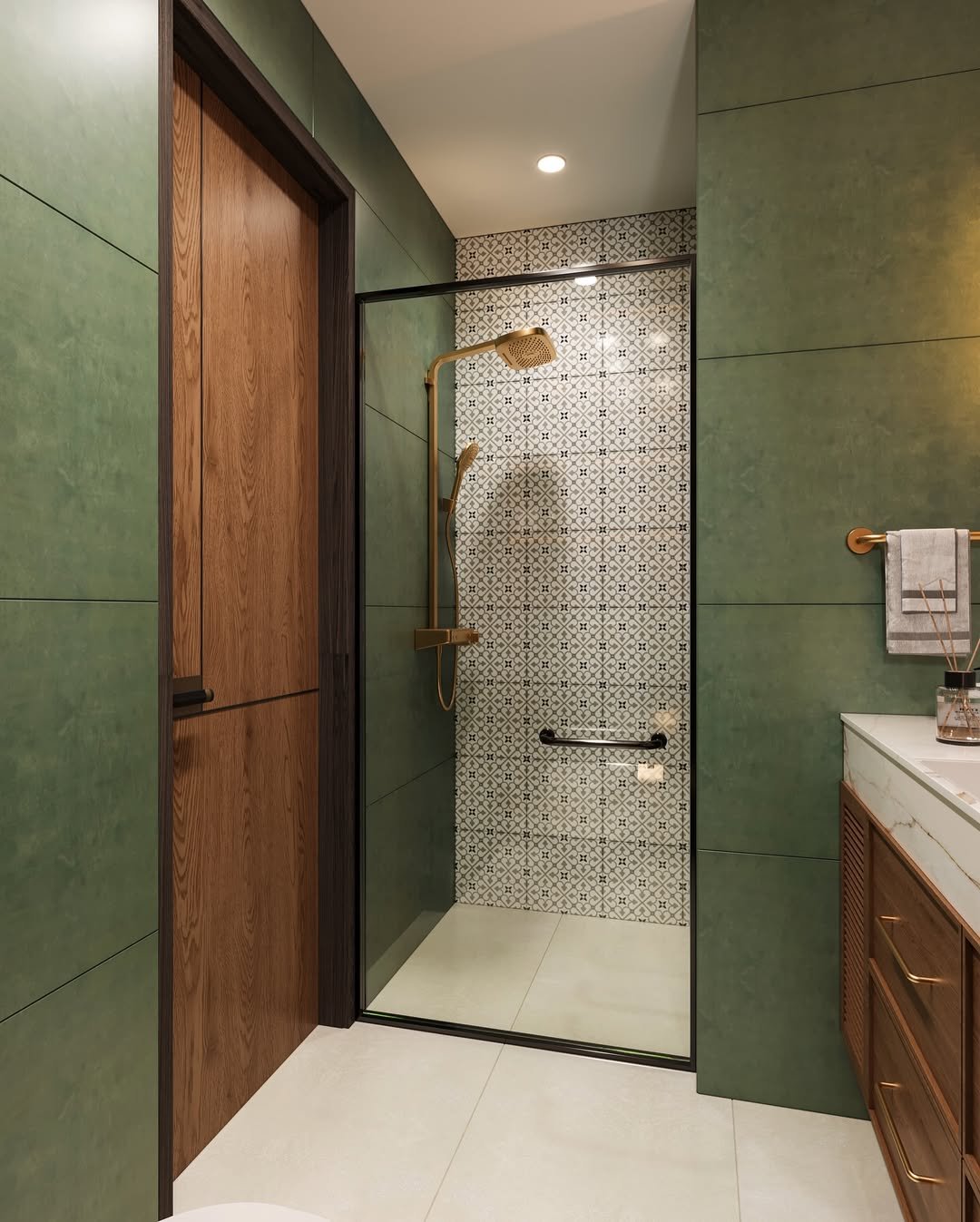 And the wood door and vanity bring in that earthy balance, stopping the green from feeling too heavy. It’s a bold choice, but it works—like a statement outfit that somehow still feels wearable.