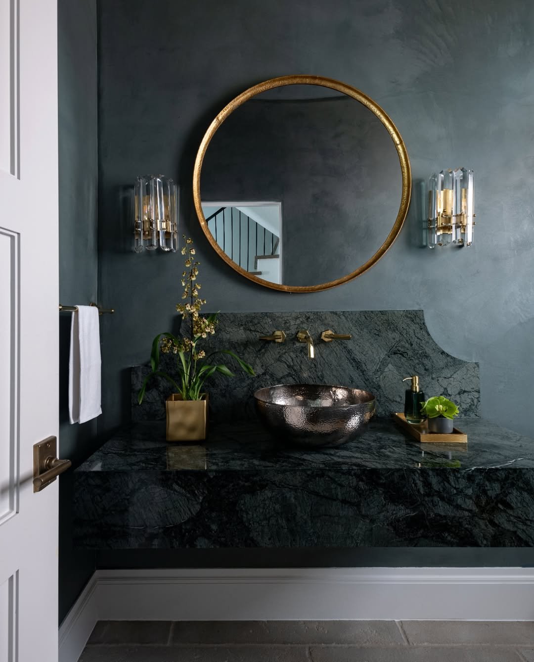 And then the gold accents come in and lift everything up just enough. It’s dark, yes—but also incredibly elegant. Definitely not your average bathroom energy.