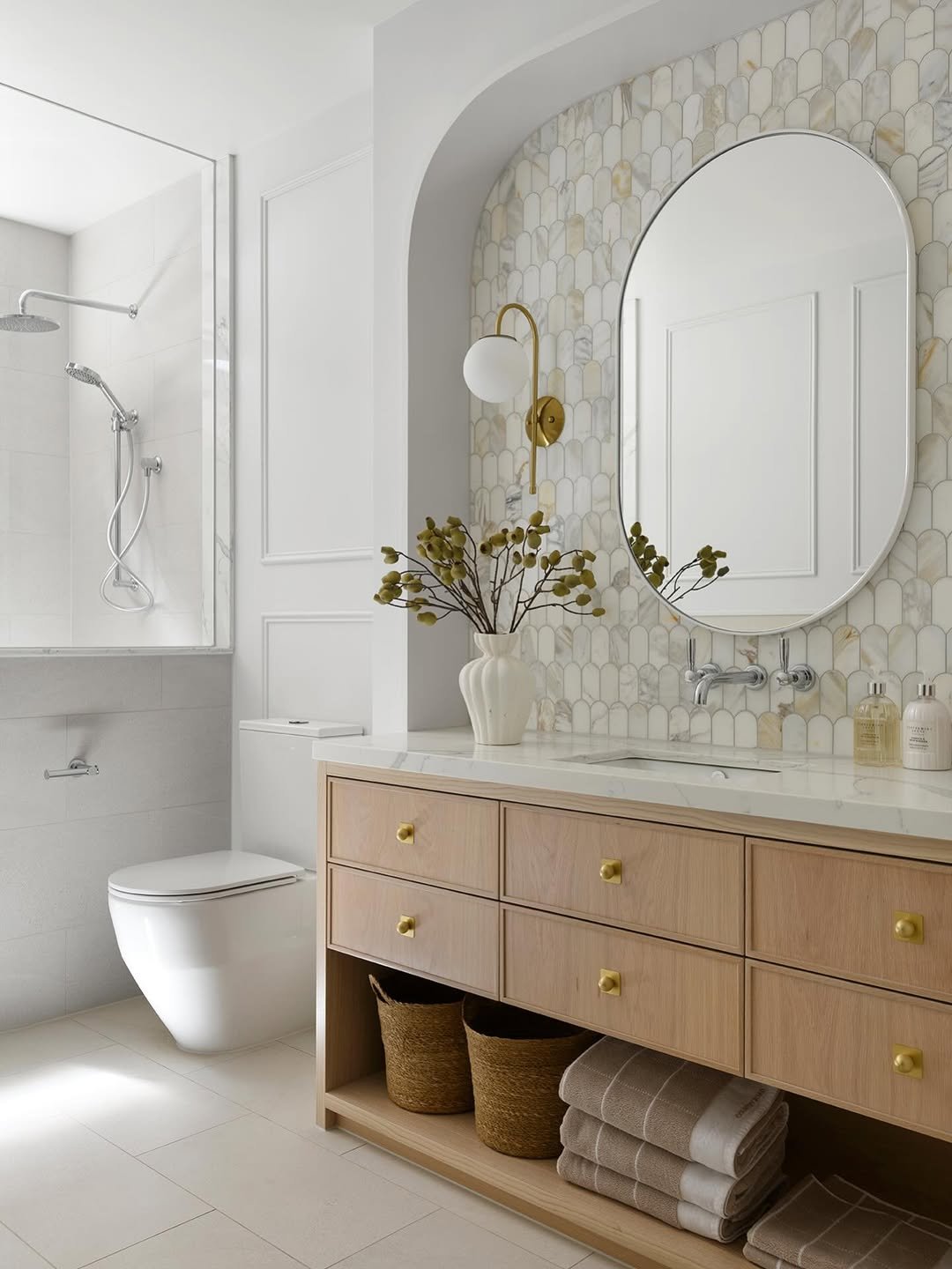 The brass accents tie everything together beautifully, adding warmth without overpowering the design. It’s giving high-end hotel, but still feels like somewhere you’d actually want to get ready every morning.