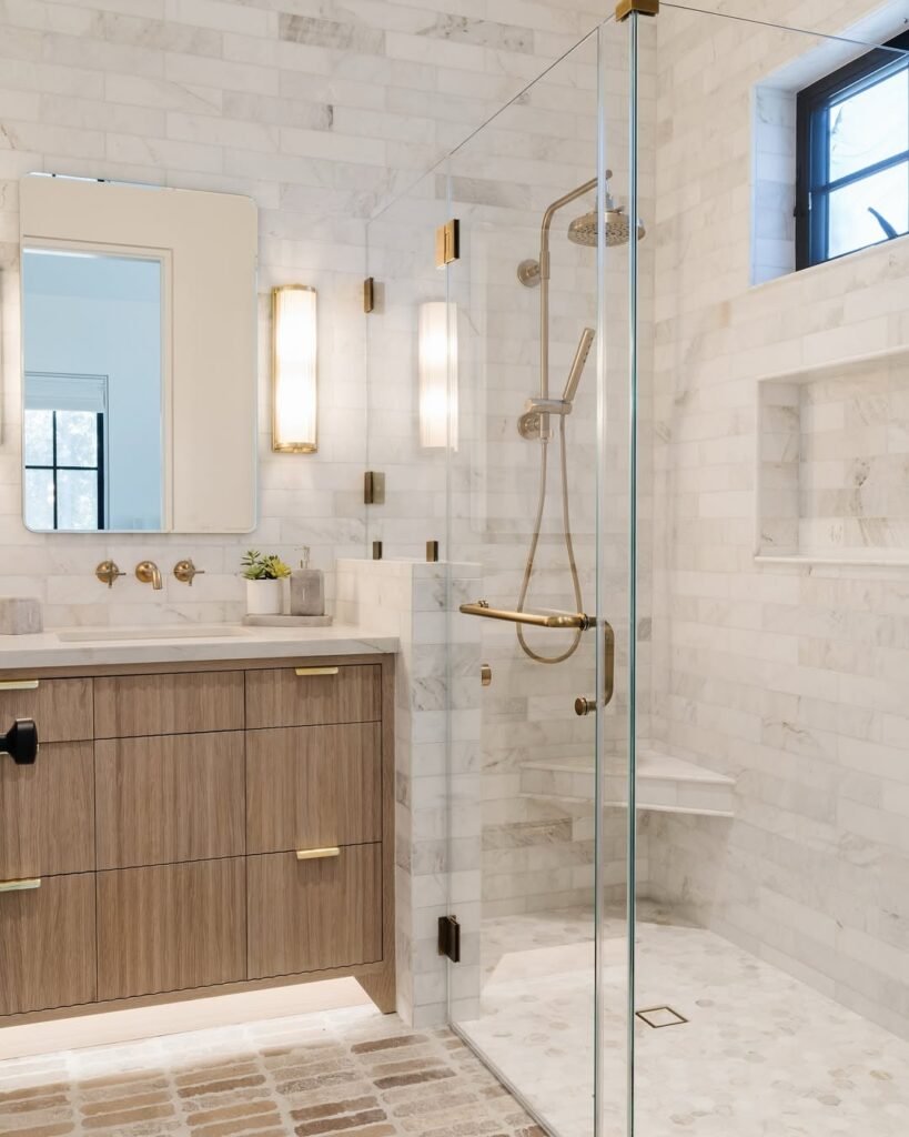 This one hits that perfect balance between crisp and cozy. The all-over marble keeps things bright and polished, while the warm wood vanity stops it from feeling too sterile. And those brass accents? Just enough shine to elevate without overpowering.