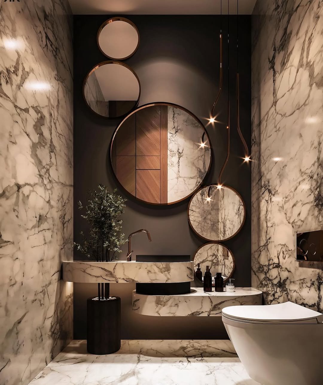 The layered round mirrors add depth without cluttering the space, and those warm hanging lights soften the entire vibe. It’s dramatic, yes—but still incredibly refined. Like dim lighting, but make it luxury.