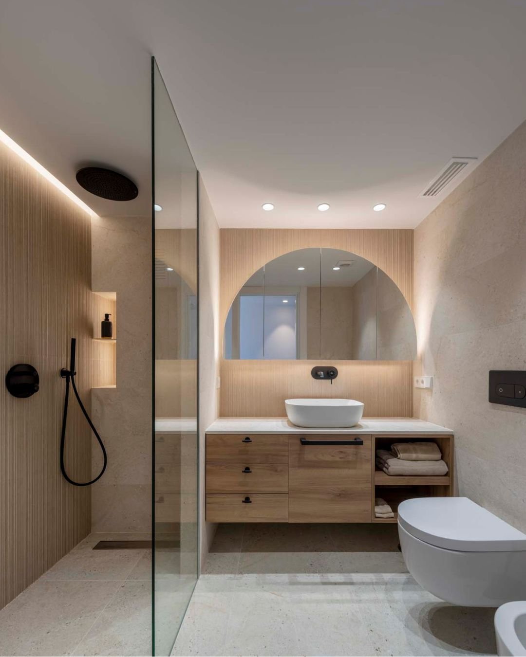 Clean lines, soft lighting, and that floating vanity—this is minimalism done properly. Nothing feels empty because the textures (wood + stone) bring just enough warmth to keep it inviting.