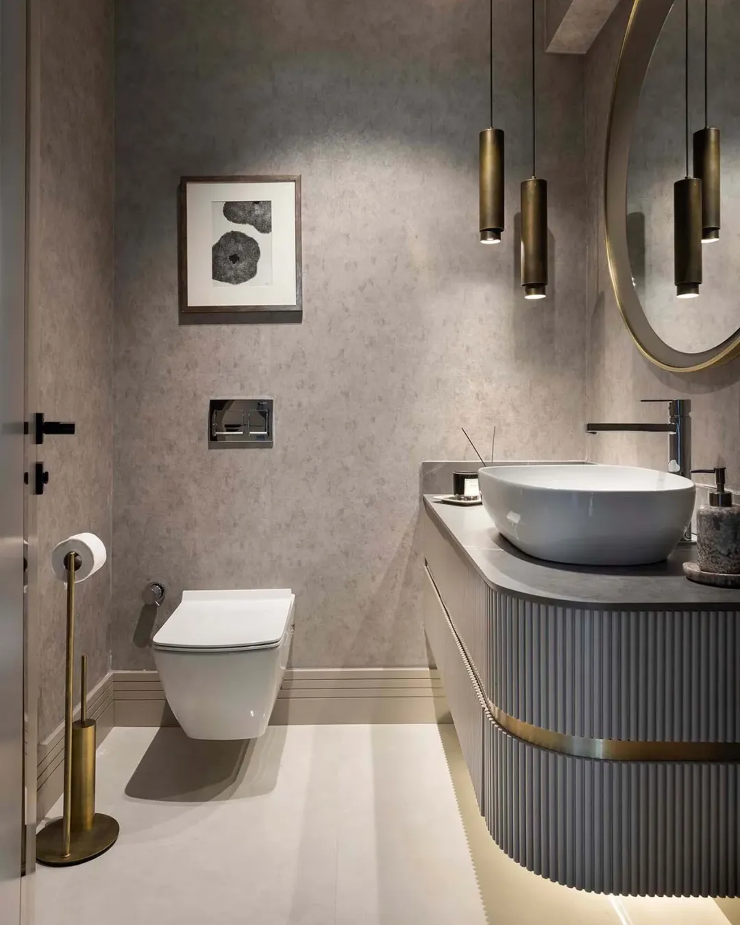 This space feels like modern art you can actually use. The curved vanity with fluted detailing is already a statement, but paired with those warm pendant lights, it becomes a full-on moment.