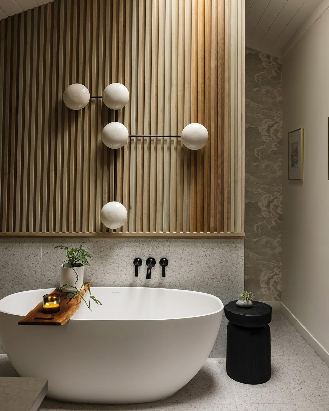 This bathroom is basically art you can use. The freestanding tub paired with that slatted wood backdrop creates a sculptural focal point that instantly draws you in.