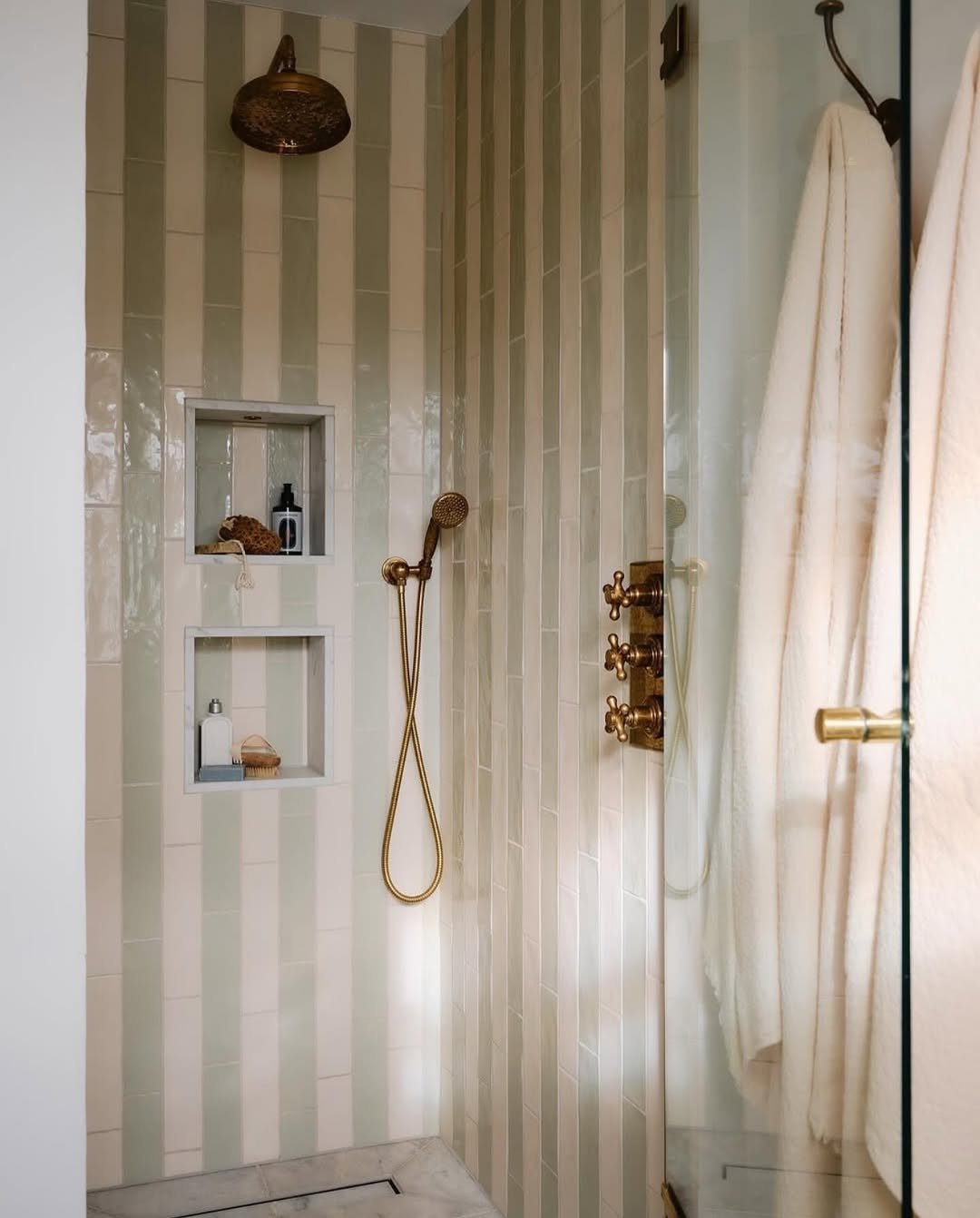 This shower is doing that quiet luxury thing without even trying. The vertical striped tiles in soft sage and cream instantly elongate the space, making it feel taller and calmer at the same time. And those brass fixtures? They warm everything up just enough so it doesn’t feel clinical—more spa, less showroom.
