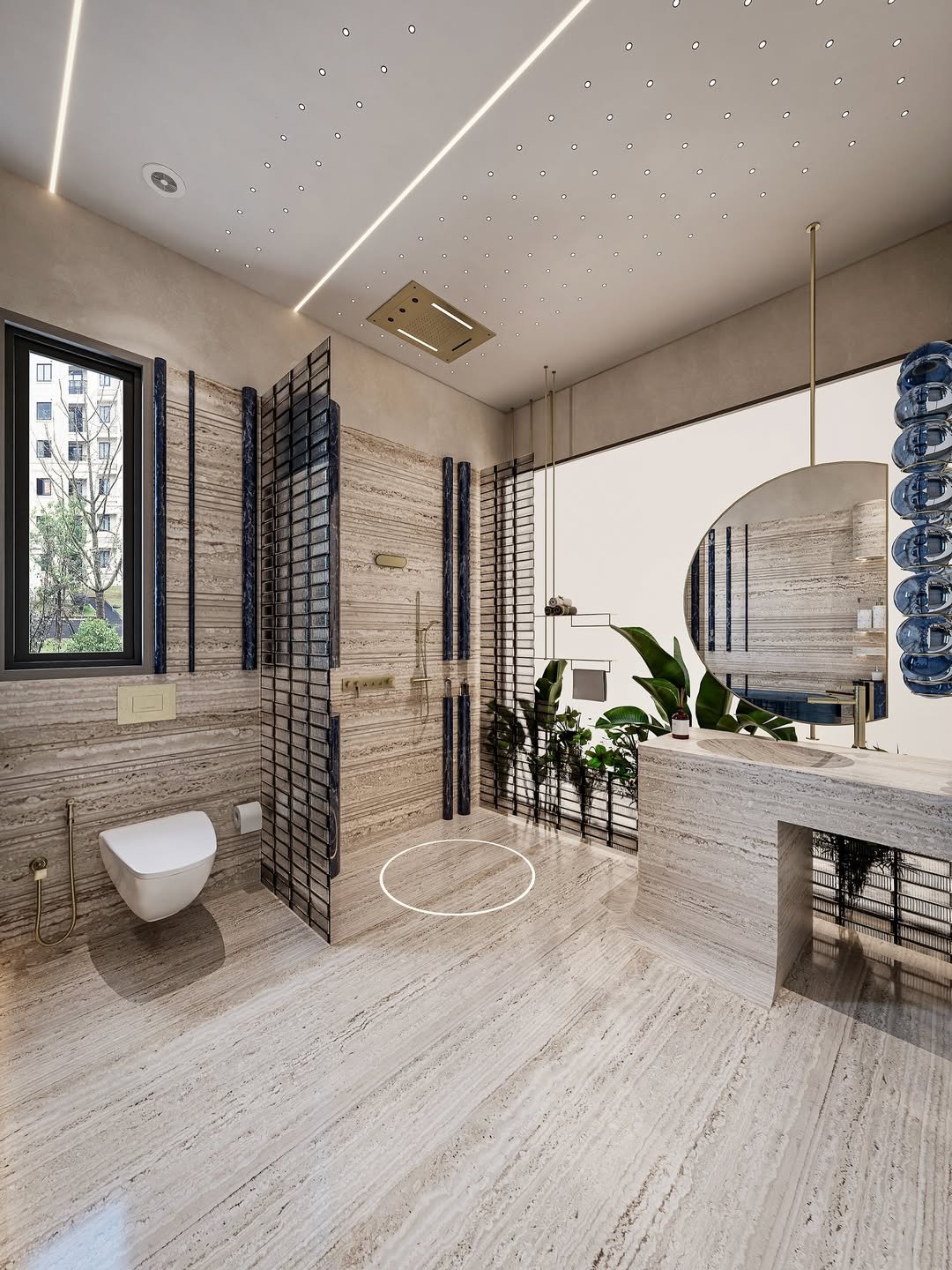 This bathroom feels like a boutique spa designed by someone who really understands texture. The stone finishes, the partition screens, the greenery—it all layers together so naturally that nothing feels forced.