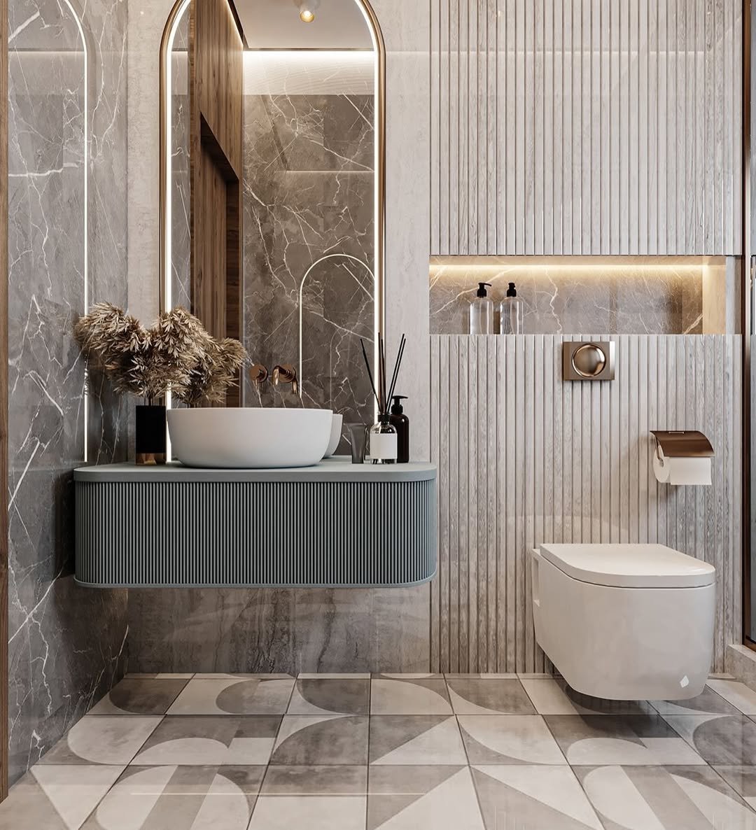 There’s a lot happening here—but in a very intentional way. The mix of fluted textures, marble walls, and patterned flooring creates layers that keep your eye moving without feeling chaotic.