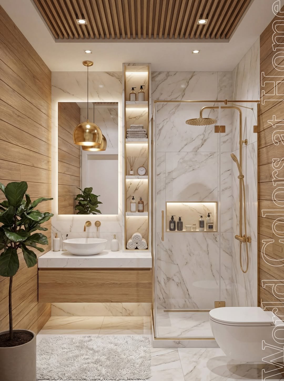 This bathroom is doing warm modern so well. The mix of wood, marble, and soft lighting creates a space that feels both elevated and inviting.