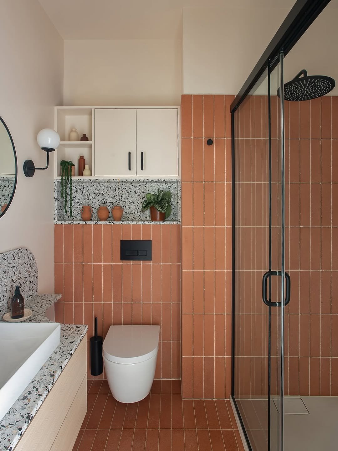This bathroom is all about color confidence. The terracotta tiles instantly energize the space, while the terrazzo and soft neutrals keep it from going overboard.