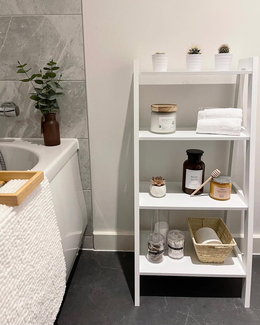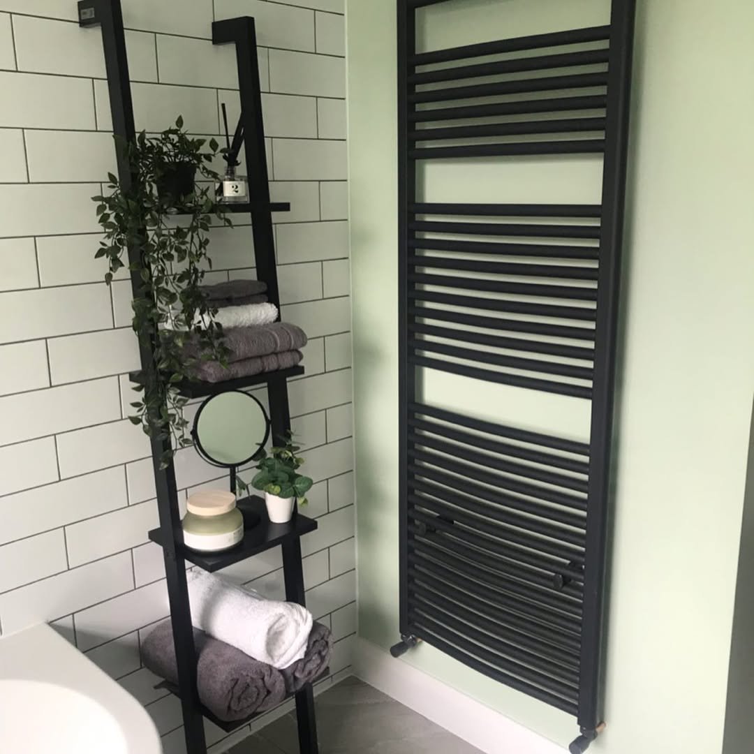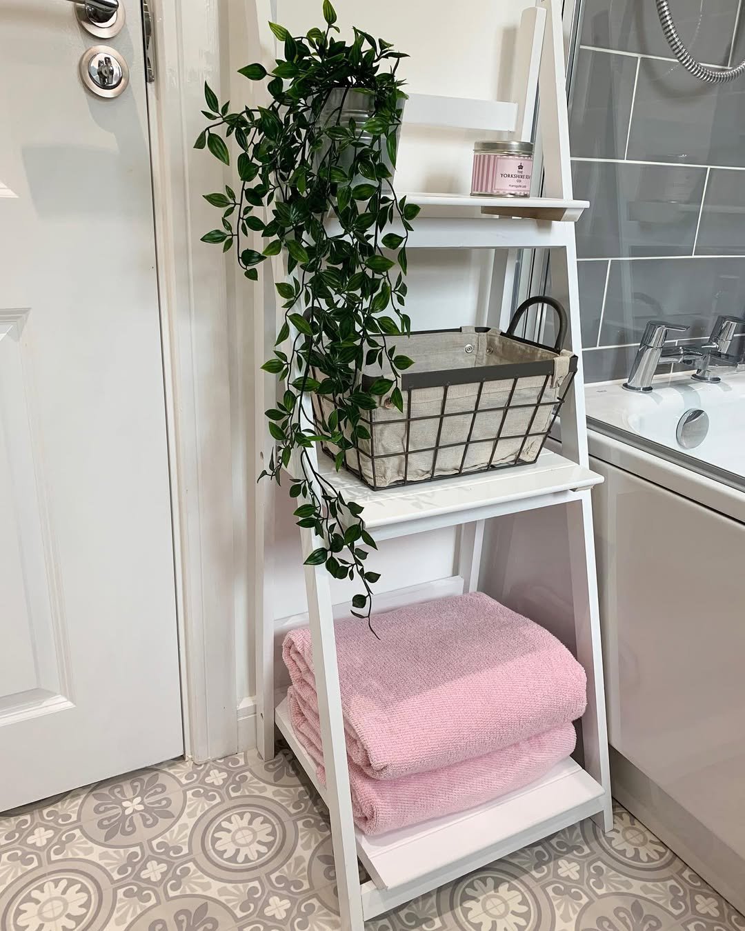 This one is all about clean lines and quiet functionality. A white ladder shelf leaning just right, stacked with fresh towels, minimal bottles, and a trailing plant that softens the whole look.