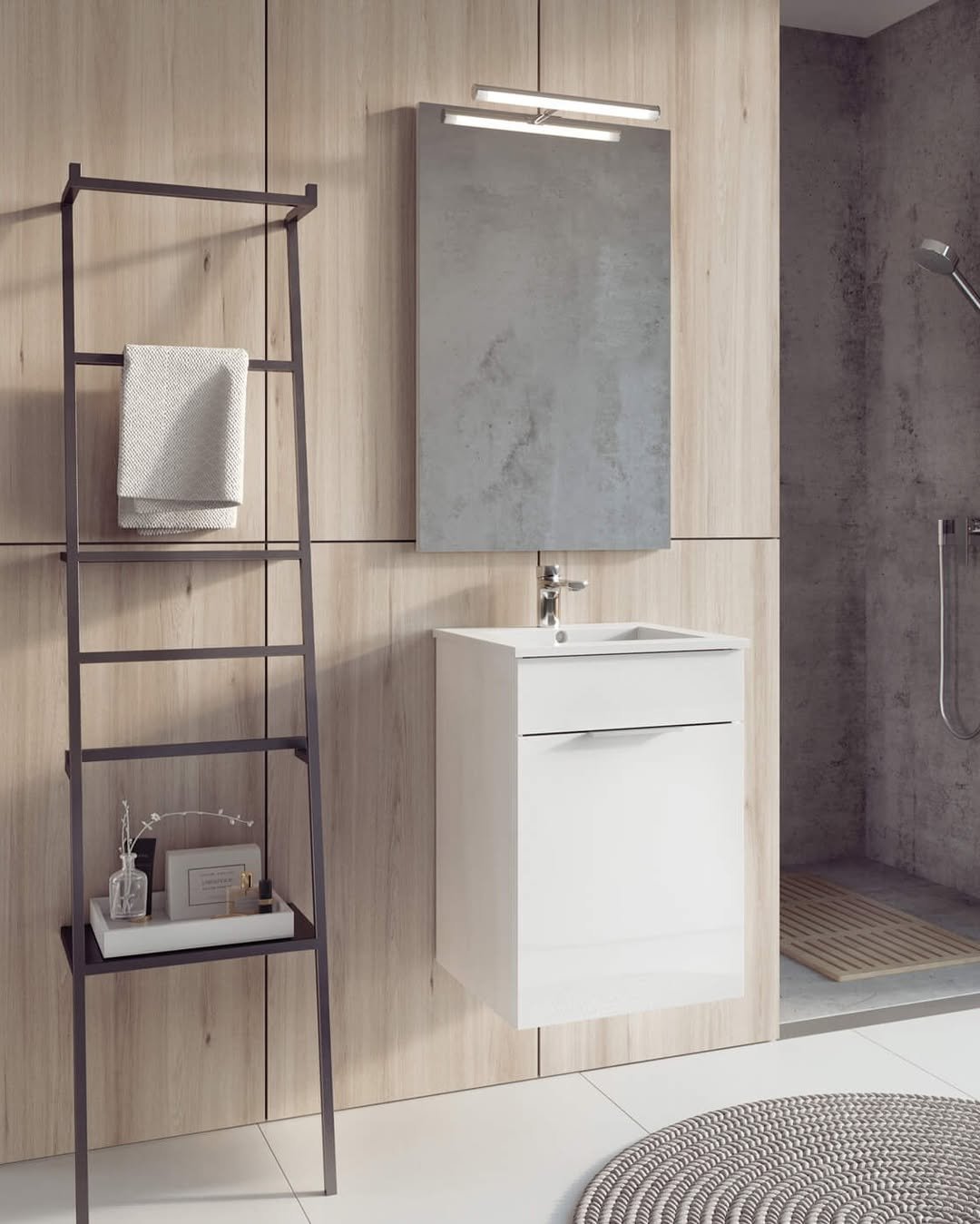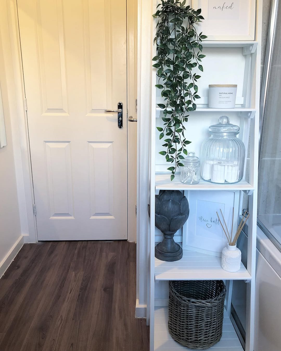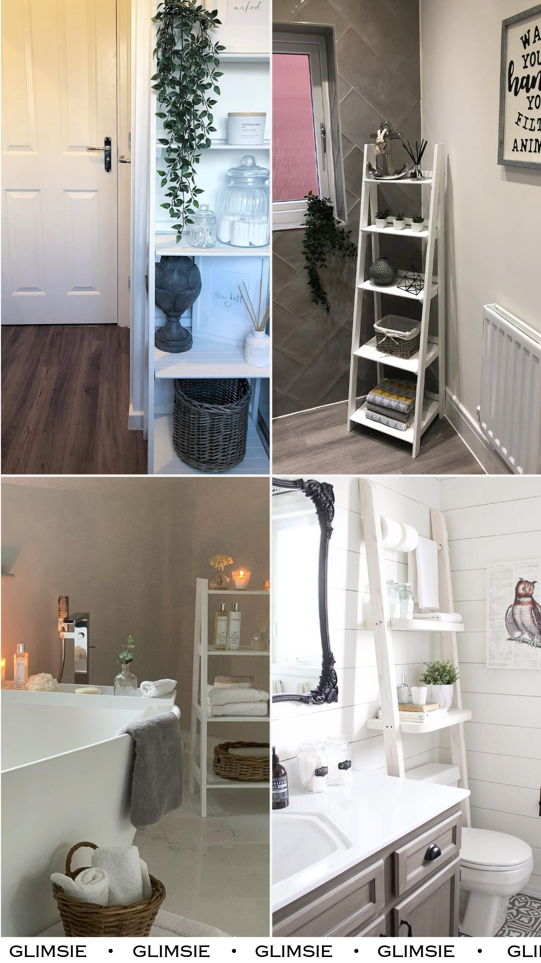 This one is all about clean lines and quiet functionality. A white ladder shelf leaning just right, stacked with fresh towels, minimal bottles, and a trailing plant that softens the whole look.